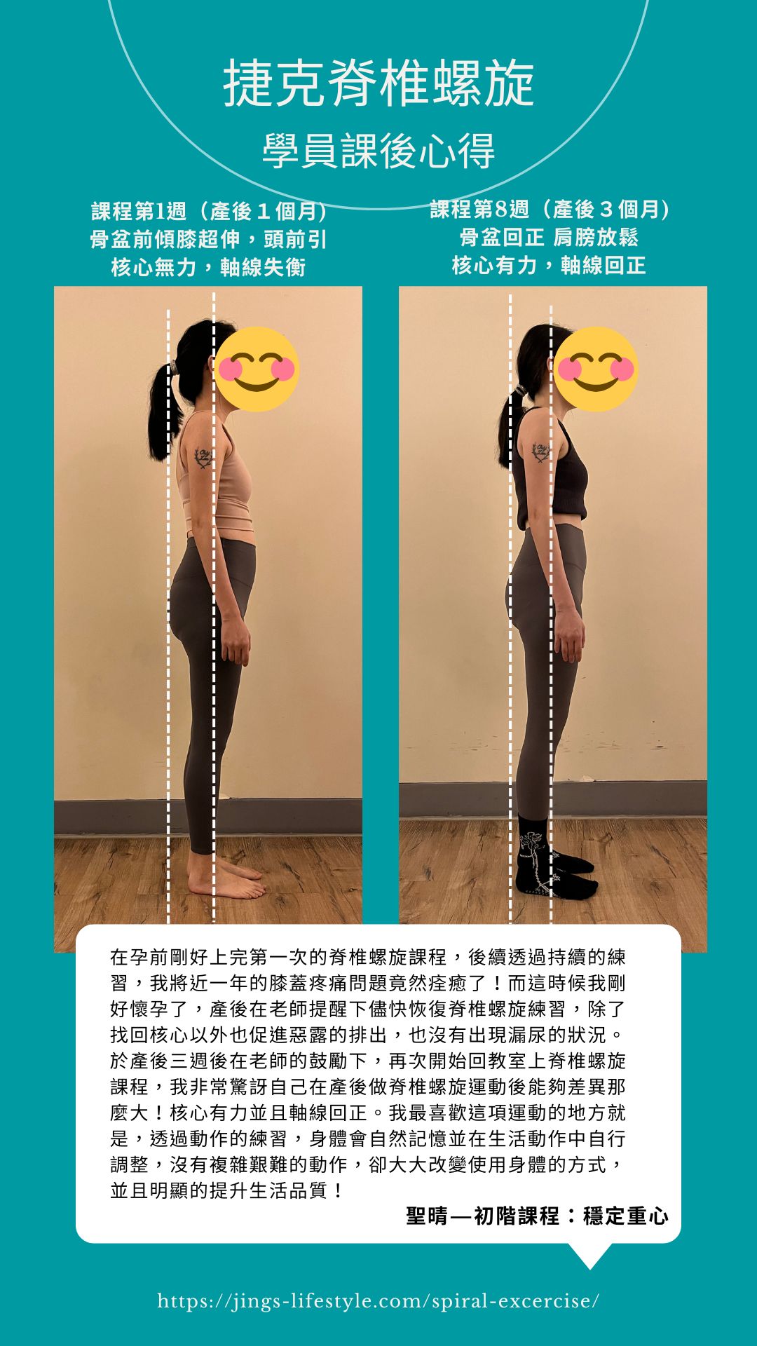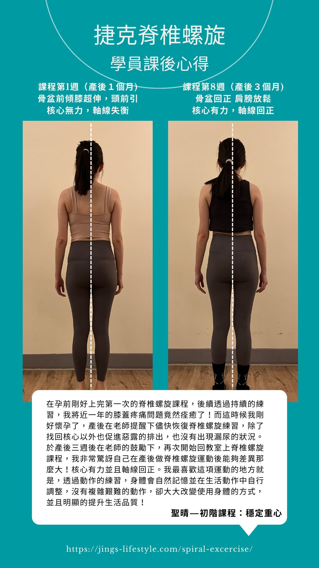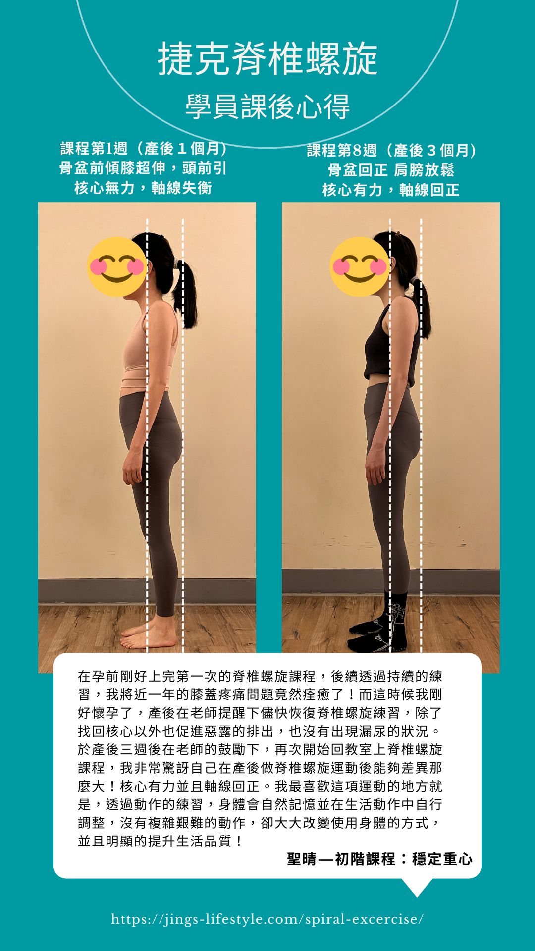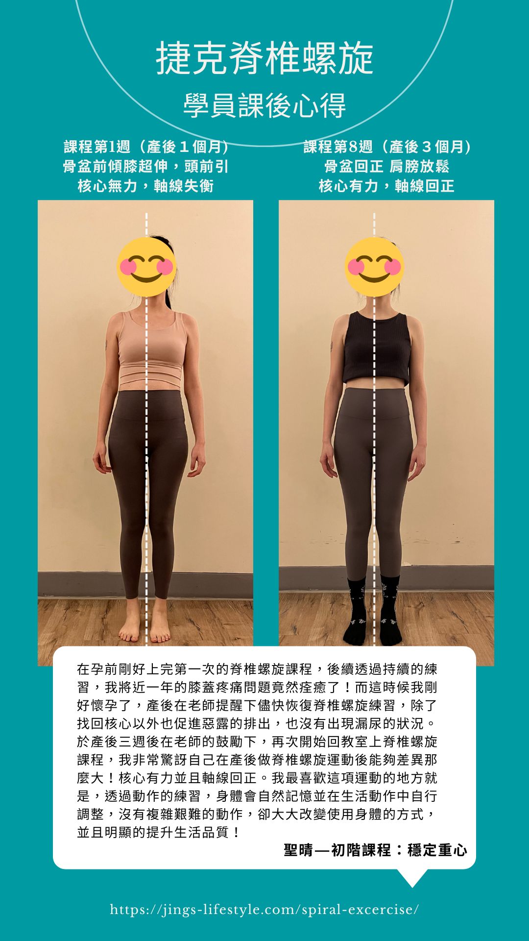 在孕前剛好上完第一次的脊椎螺旋課程,後續透過持續的練習,我將近一年的膝蓋疼痛問題竟然痊癒了!而這時候我剛好懷孕了,本來很擔心膝蓋問題會復發,結果不僅沒有,連到懷孕後期常見的腰痛問題,我也僅感覺偶爾腰痠而已!產後在老師提醒下儘快恢復脊椎螺旋練習,除了找回核心以外也促進惡露的排出,也沒有出現漏尿的狀況。 於產後三週後在老師的鼓勵下,再次開始回教室上脊椎螺旋課程,本來還很猶豫,而現在我會說這是我產後做過棒的決定!在第一堂課程時我發現使用核心肌群明顯比以往更加吃力,透過自我察覺不斷的在動作中進行調整,平時在抱小孩的時候,也會不斷自我提醒用正確的發力方式,難免腰酸背痛的時候趕快做一組螺旋運動,也能馬上感覺到肌肉放鬆與疼痛緩解! 在練習前後的照片中,我非常驚訝自己在產後做脊椎螺旋運動後能夠差異那麼大!核心有力並且軸線回正,我最喜歡這項運動的地方就是,透過動作的練習,身體會自然記憶並在生活動作中自行調整,沒有複雜艱難的動作,卻大大改變使用身體的方式,並且明顯的提升生活品質!現在因為常常抱小孩的關係,身體仍有向左偏的情形,這也是透過老師的相片紀錄跟去年比較赫然發現的,我也才驚覺原來生活狀態影響身體會這麼的立即與明顯,因為我真的都是用左手在抱孩子,不過我相信透過持續的練習跟平常發力的調整,我的身體與體態會更加健康與穩定!