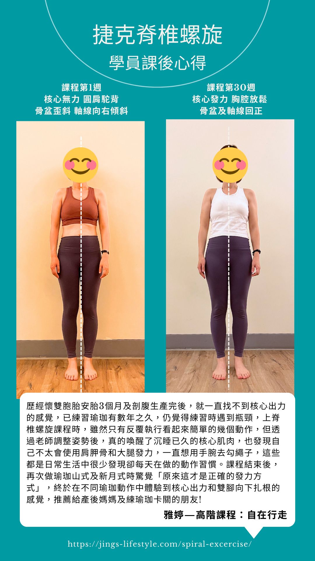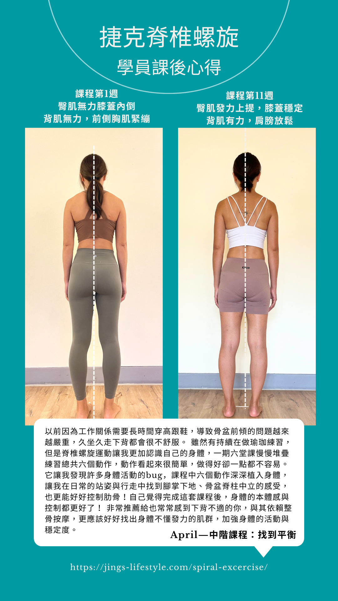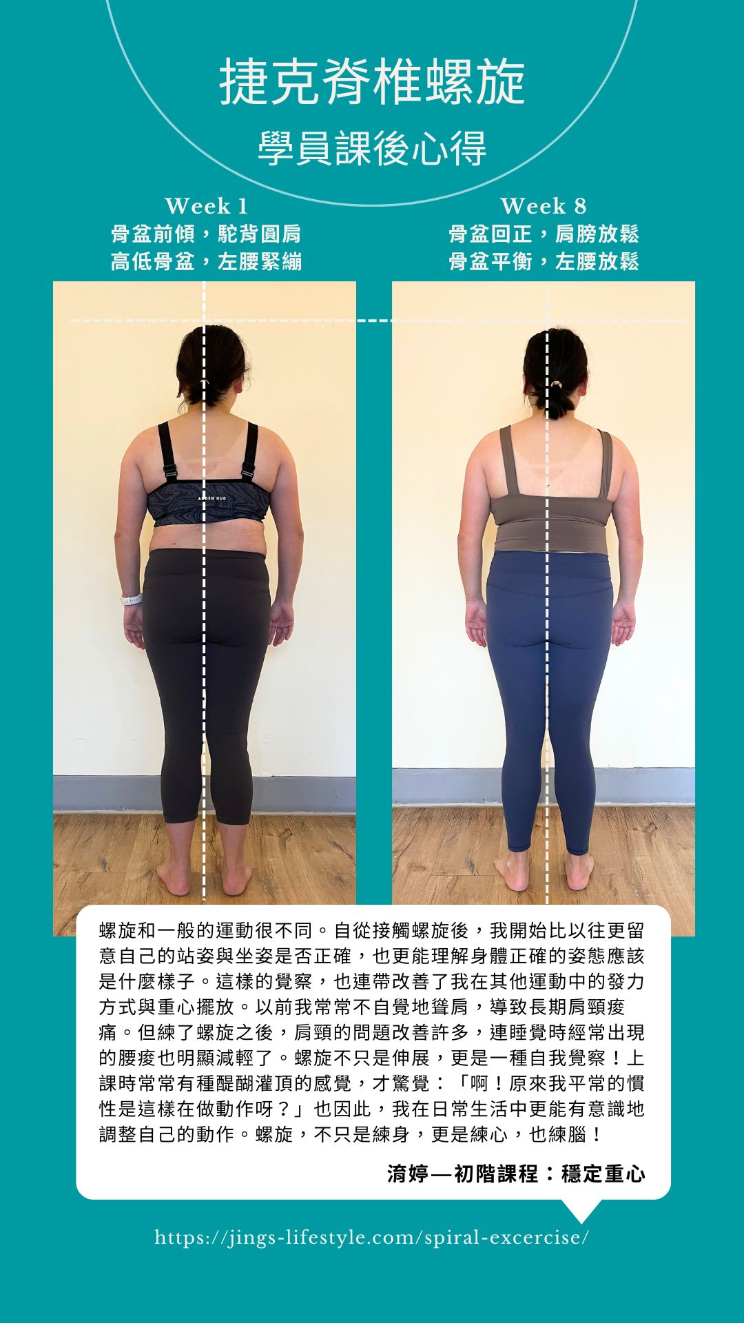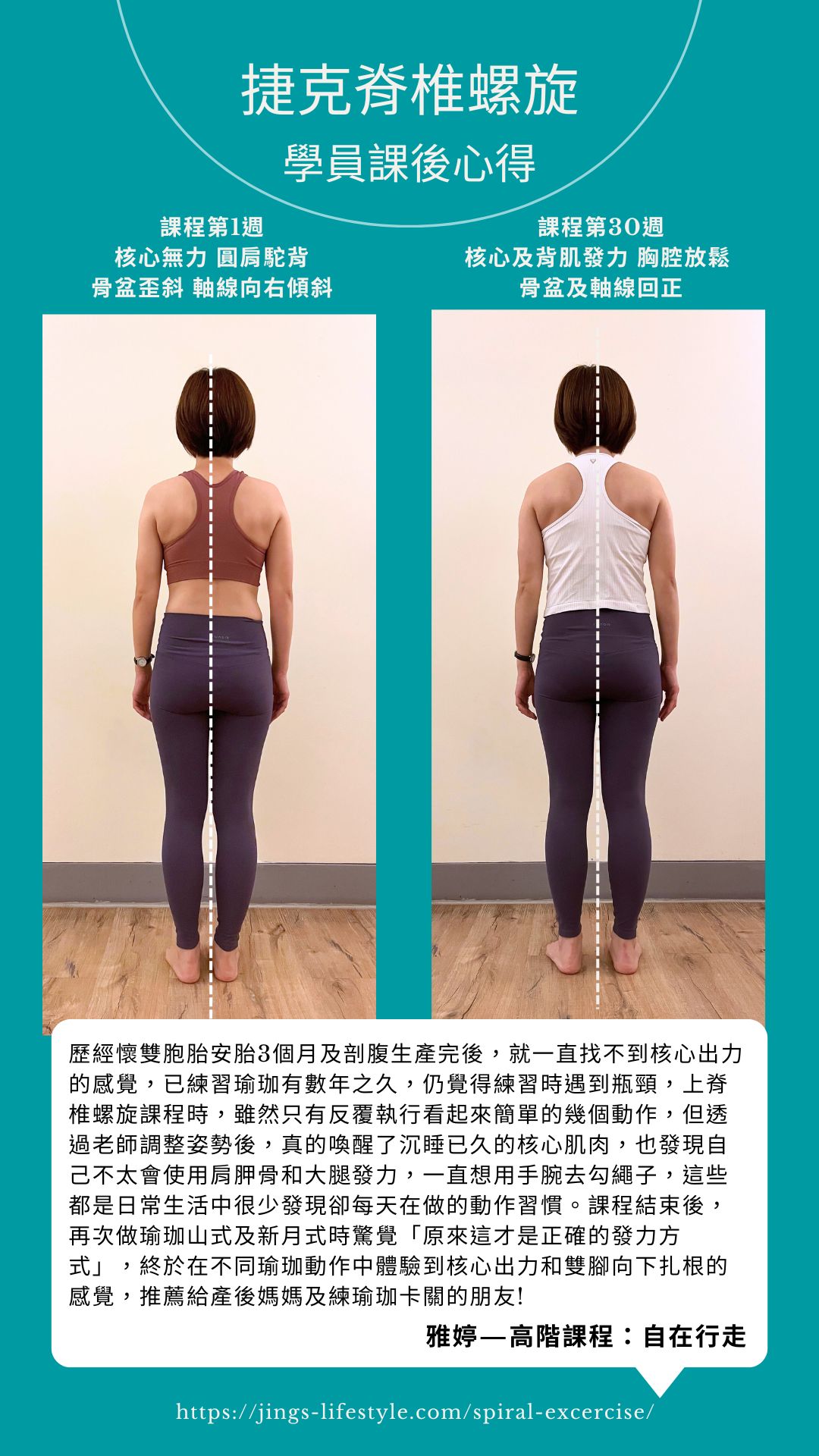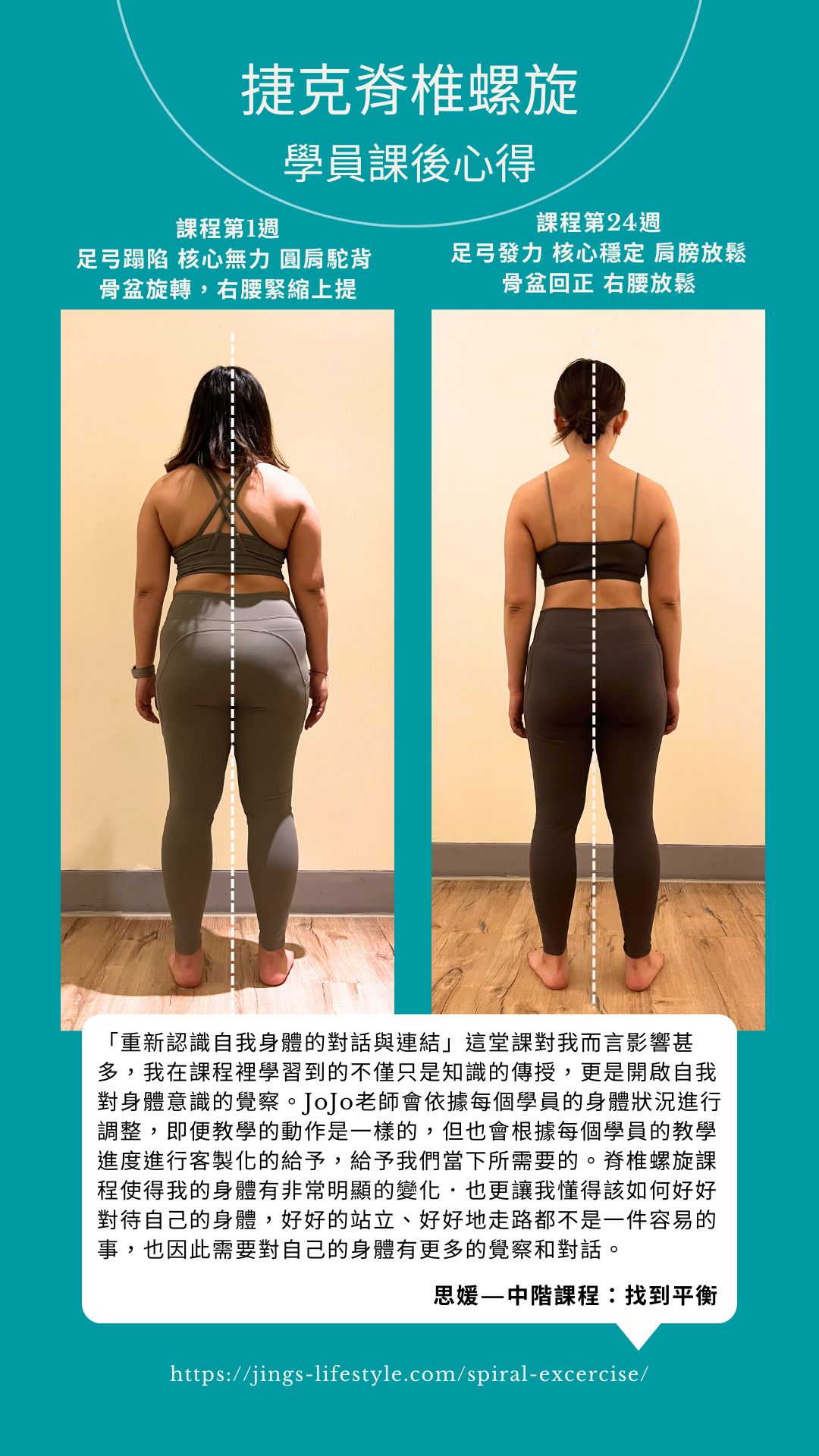 在孕前剛好上完第一次的脊椎螺旋課程,後續透過持續的練習,我將近一年的膝蓋疼痛問題竟然痊癒了!而這時候我剛好懷孕了,本來很擔心膝蓋問題會復發,結果不僅沒有,連到懷孕後期常見的腰痛問題,我也僅感覺偶爾腰痠而已!產後在老師提醒下儘快恢復脊椎螺旋練習,除了找回核心以外也促進惡露的排出,也沒有出現漏尿的狀況。 於產後三週後在老師的鼓勵下,再次開始回教室上脊椎螺旋課程,本來還很猶豫,而現在我會說這是我產後做過棒的決定!在第一堂課程時我發現使用核心肌群明顯比以往更加吃力,透過自我察覺不斷的在動作中進行調整,平時在抱小孩的時候,也會不斷自我提醒用正確的發力方式,難免腰酸背痛的時候趕快做一組螺旋運動,也能馬上感覺到肌肉放鬆與疼痛緩解! 在練習前後的照片中,我非常驚訝自己在產後做脊椎螺旋運動後能夠差異那麼大!核心有力並且軸線回正,我最喜歡這項運動的地方就是,透過動作的練習,身體會自然記憶並在生活動作中自行調整,沒有複雜艱難的動作,卻大大改變使用身體的方式,並且明顯的提升生活品質!現在因為常常抱小孩的關係,身體仍有向左偏的情形,這也是透過老師的相片紀錄跟去年比較赫然發現的,我也才驚覺原來生活狀態影響身體會這麼的立即與明顯,因為我真的都是用左手在抱孩子,不過我相信透過持續的練習跟平常發力的調整,我的身體與體態會更加健康與穩定!