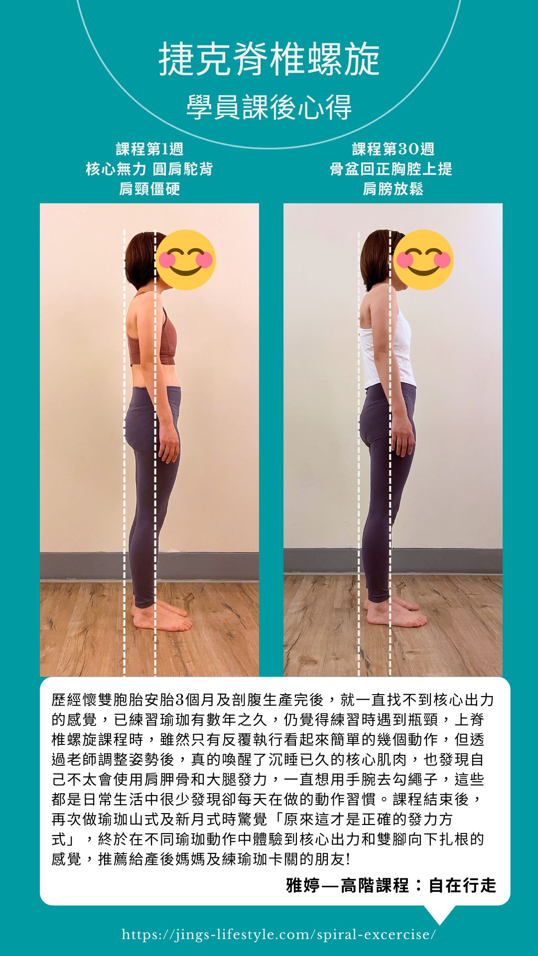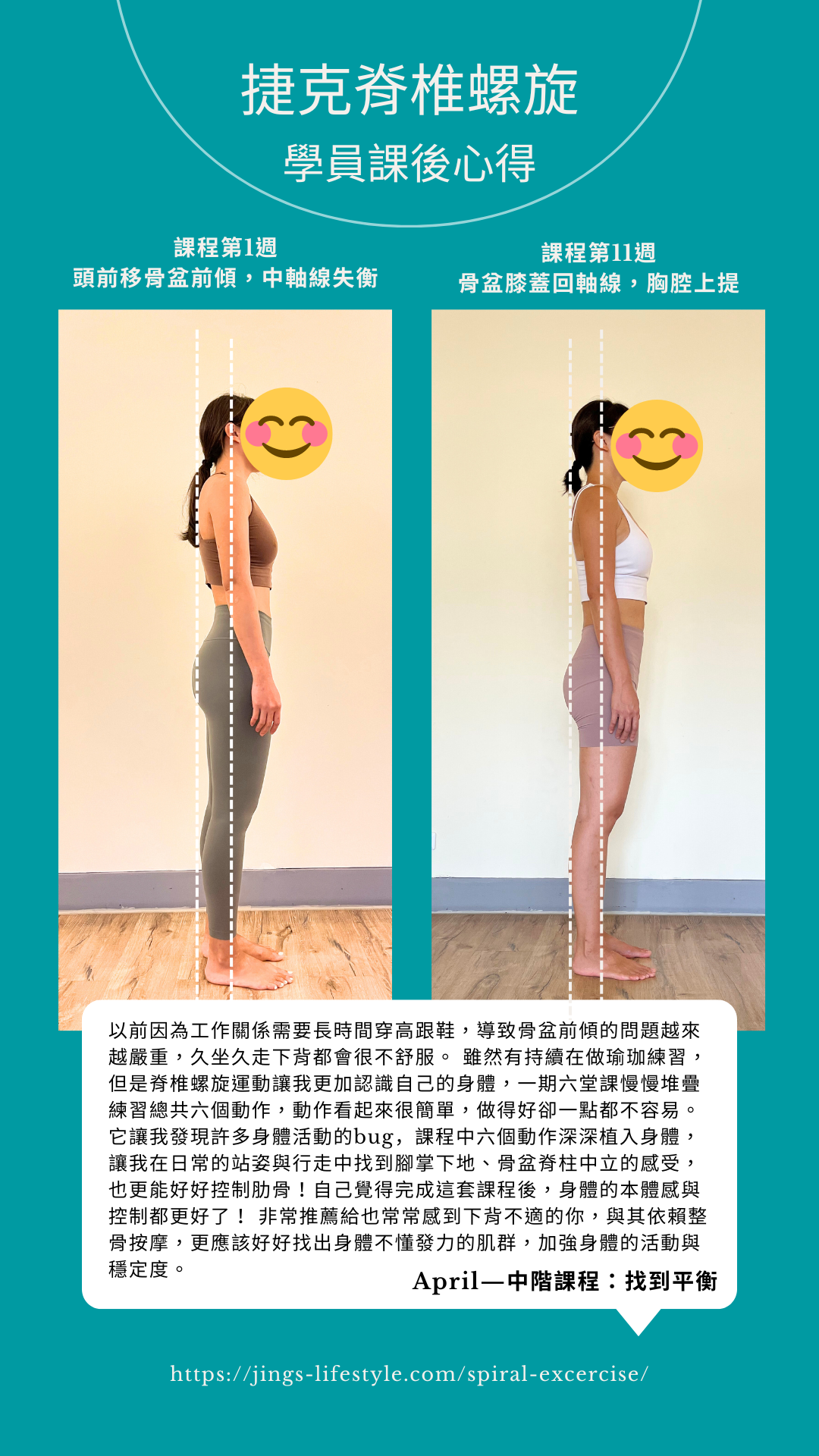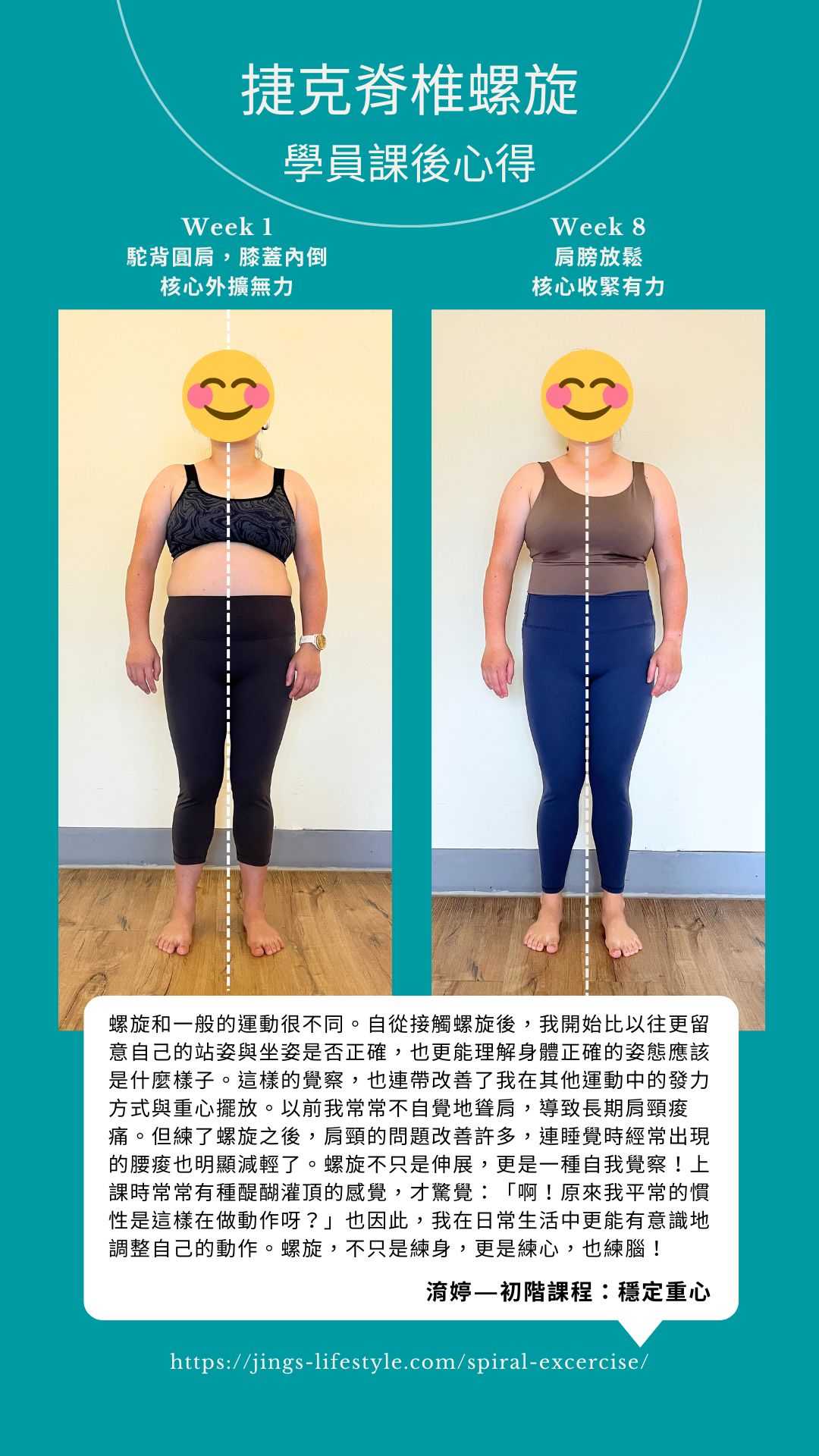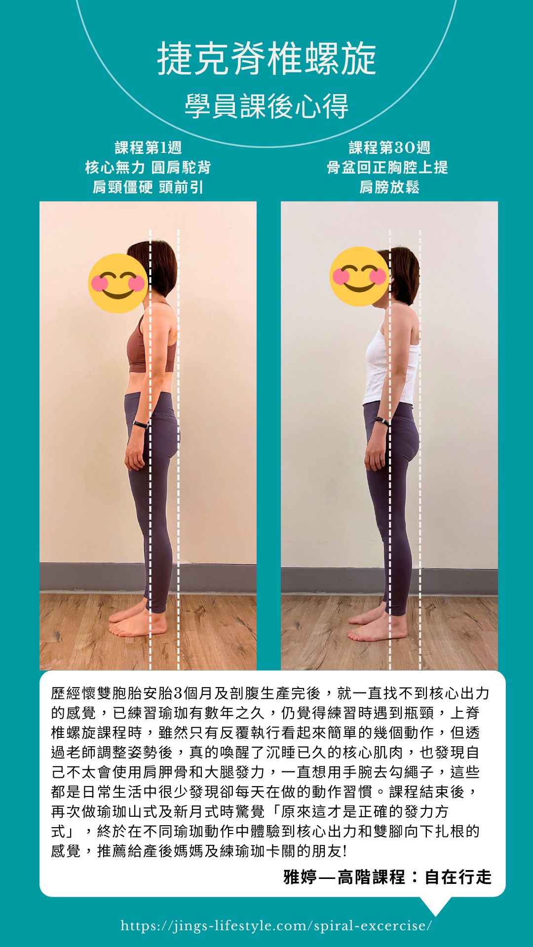 在孕前剛好上完第一次的脊椎螺旋課程,後續透過持續的練習,我將近一年的膝蓋疼痛問題竟然痊癒了!而這時候我剛好懷孕了,本來很擔心膝蓋問題會復發,結果不僅沒有,連到懷孕後期常見的腰痛問題,我也僅感覺偶爾腰痠而已!產後在老師提醒下儘快恢復脊椎螺旋練習,除了找回核心以外也促進惡露的排出,也沒有出現漏尿的狀況。 於產後三週後在老師的鼓勵下,再次開始回教室上脊椎螺旋課程,本來還很猶豫,而現在我會說這是我產後做過棒的決定!在第一堂課程時我發現使用核心肌群明顯比以往更加吃力,透過自我察覺不斷的在動作中進行調整,平時在抱小孩的時候,也會不斷自我提醒用正確的發力方式,難免腰酸背痛的時候趕快做一組螺旋運動,也能馬上感覺到肌肉放鬆與疼痛緩解! 在練習前後的照片中,我非常驚訝自己在產後做脊椎螺旋運動後能夠差異那麼大!核心有力並且軸線回正,我最喜歡這項運動的地方就是,透過動作的練習,身體會自然記憶並在生活動作中自行調整,沒有複雜艱難的動作,卻大大改變使用身體的方式,並且明顯的提升生活品質!現在因為常常抱小孩的關係,身體仍有向左偏的情形,這也是透過老師的相片紀錄跟去年比較赫然發現的,我也才驚覺原來生活狀態影響身體會這麼的立即與明顯,因為我真的都是用左手在抱孩子,不過我相信透過持續的練習跟平常發力的調整,我的身體與體態會更加健康與穩定!