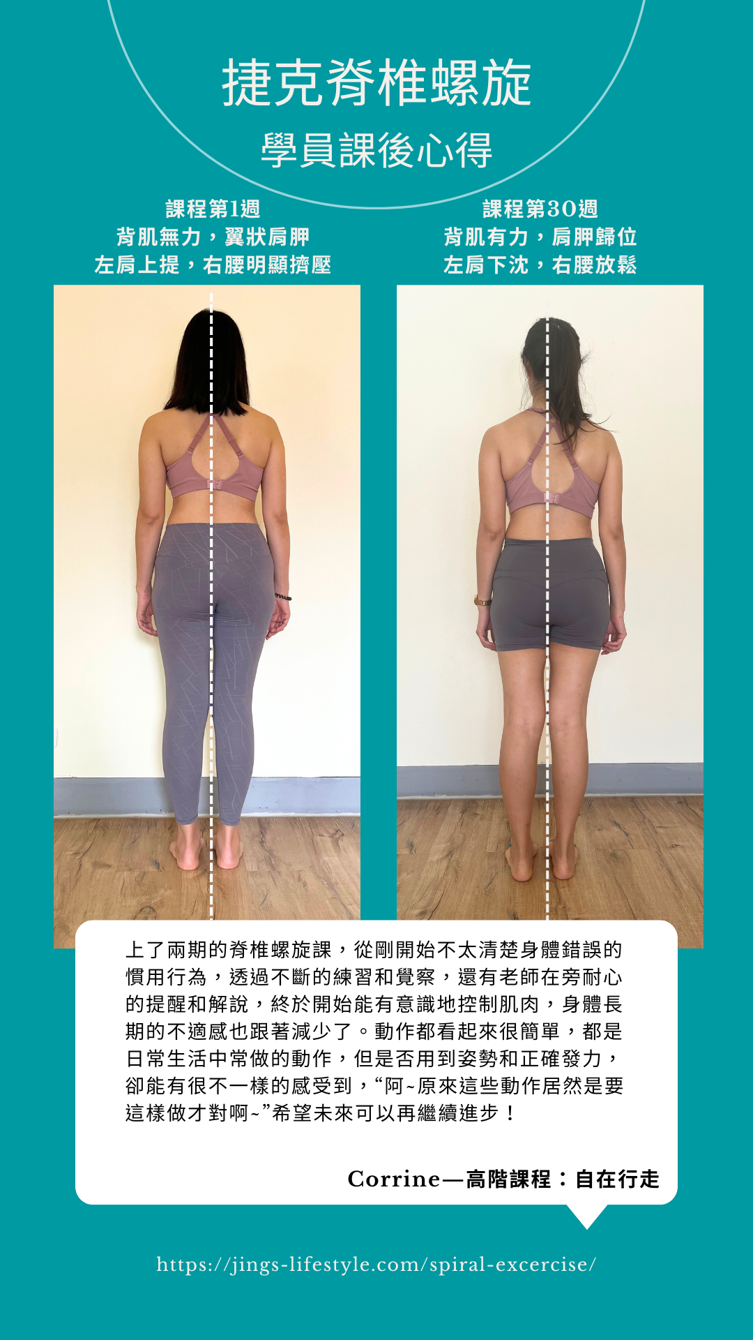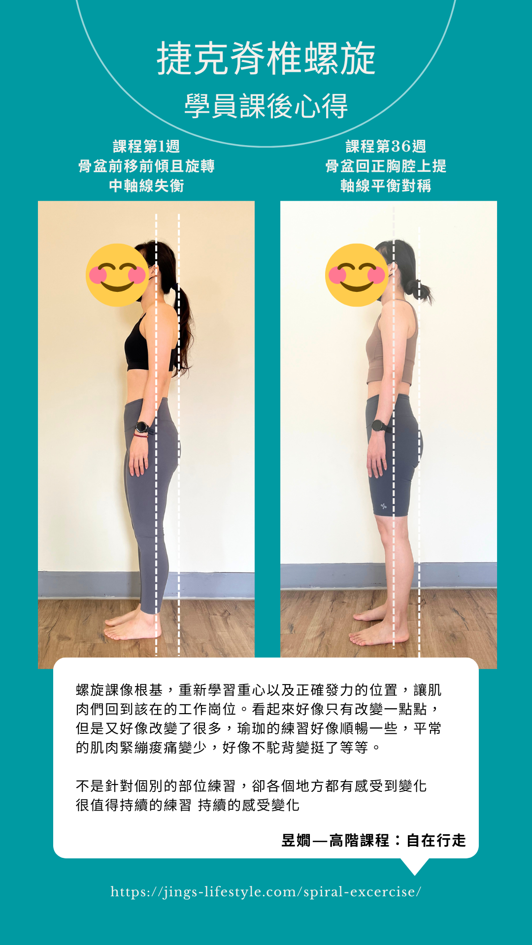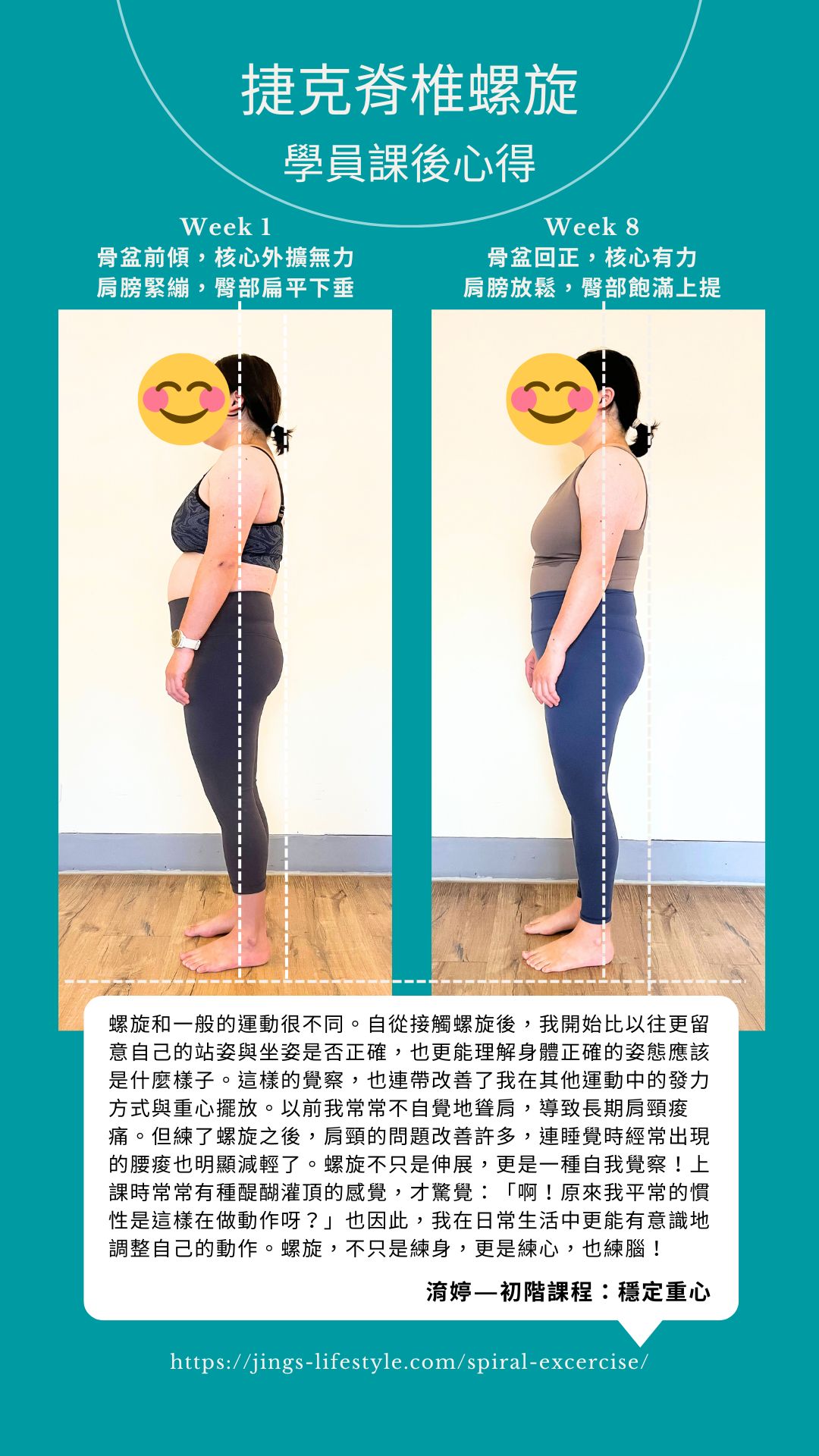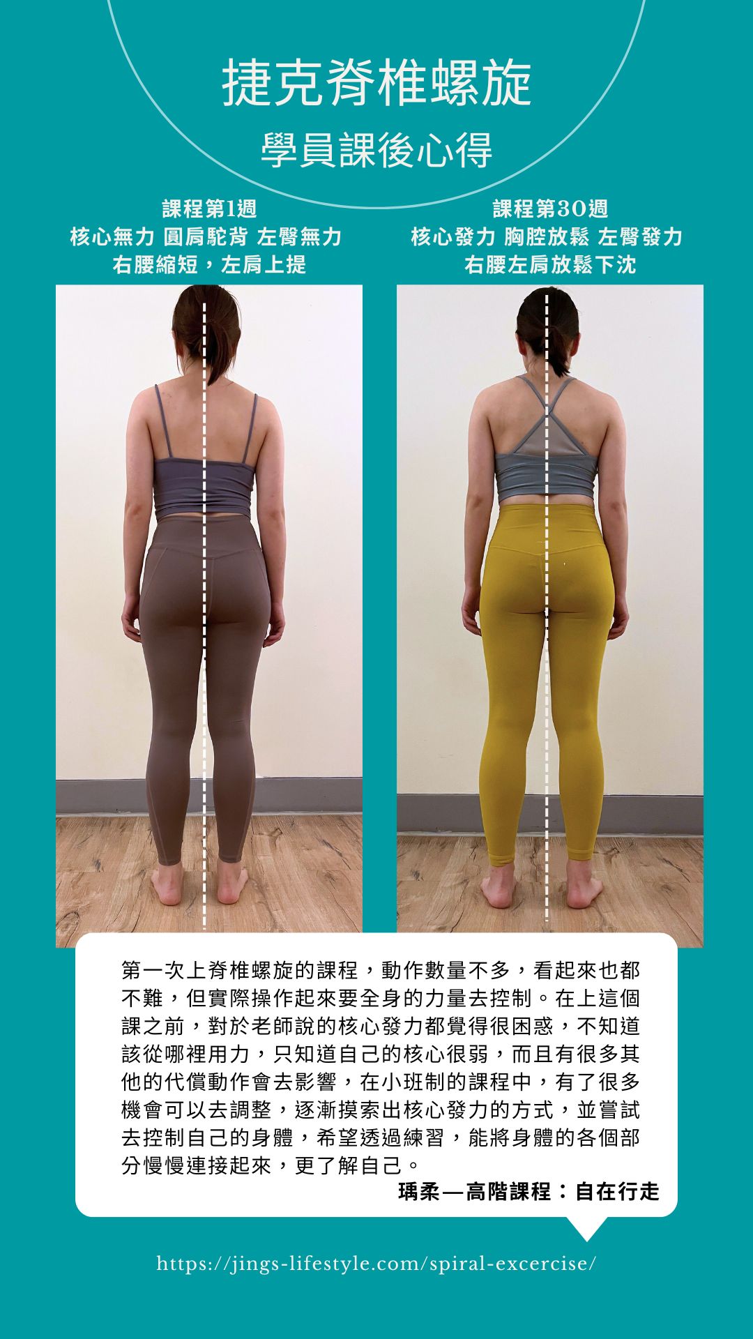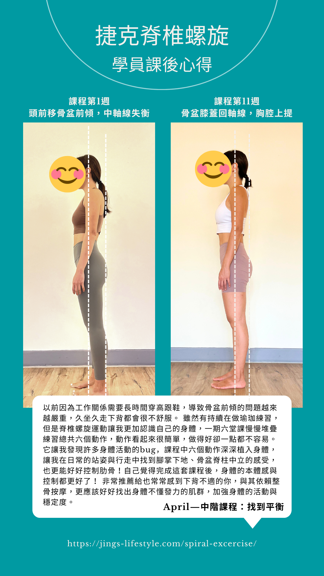 在孕前剛好上完第一次的脊椎螺旋課程,後續透過持續的練習,我將近一年的膝蓋疼痛問題竟然痊癒了!而這時候我剛好懷孕了,本來很擔心膝蓋問題會復發,結果不僅沒有,連到懷孕後期常見的腰痛問題,我也僅感覺偶爾腰痠而已!產後在老師提醒下儘快恢復脊椎螺旋練習,除了找回核心以外也促進惡露的排出,也沒有出現漏尿的狀況。 於產後三週後在老師的鼓勵下,再次開始回教室上脊椎螺旋課程,本來還很猶豫,而現在我會說這是我產後做過棒的決定!在第一堂課程時我發現使用核心肌群明顯比以往更加吃力,透過自我察覺不斷的在動作中進行調整,平時在抱小孩的時候,也會不斷自我提醒用正確的發力方式,難免腰酸背痛的時候趕快做一組螺旋運動,也能馬上感覺到肌肉放鬆與疼痛緩解! 在練習前後的照片中,我非常驚訝自己在產後做脊椎螺旋運動後能夠差異那麼大!核心有力並且軸線回正,我最喜歡這項運動的地方就是,透過動作的練習,身體會自然記憶並在生活動作中自行調整,沒有複雜艱難的動作,卻大大改變使用身體的方式,並且明顯的提升生活品質!現在因為常常抱小孩的關係,身體仍有向左偏的情形,這也是透過老師的相片紀錄跟去年比較赫然發現的,我也才驚覺原來生活狀態影響身體會這麼的立即與明顯,因為我真的都是用左手在抱孩子,不過我相信透過持續的練習跟平常發力的調整,我的身體與體態會更加健康與穩定!