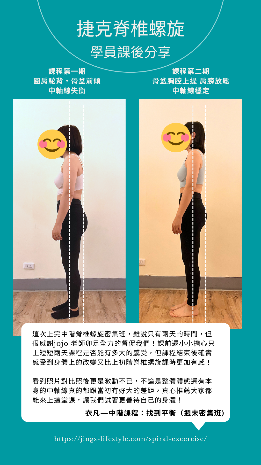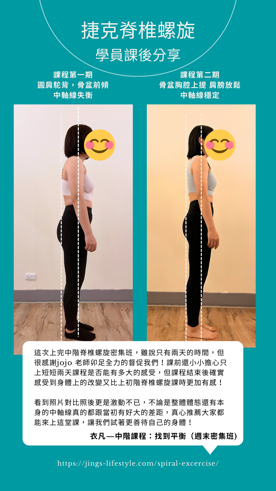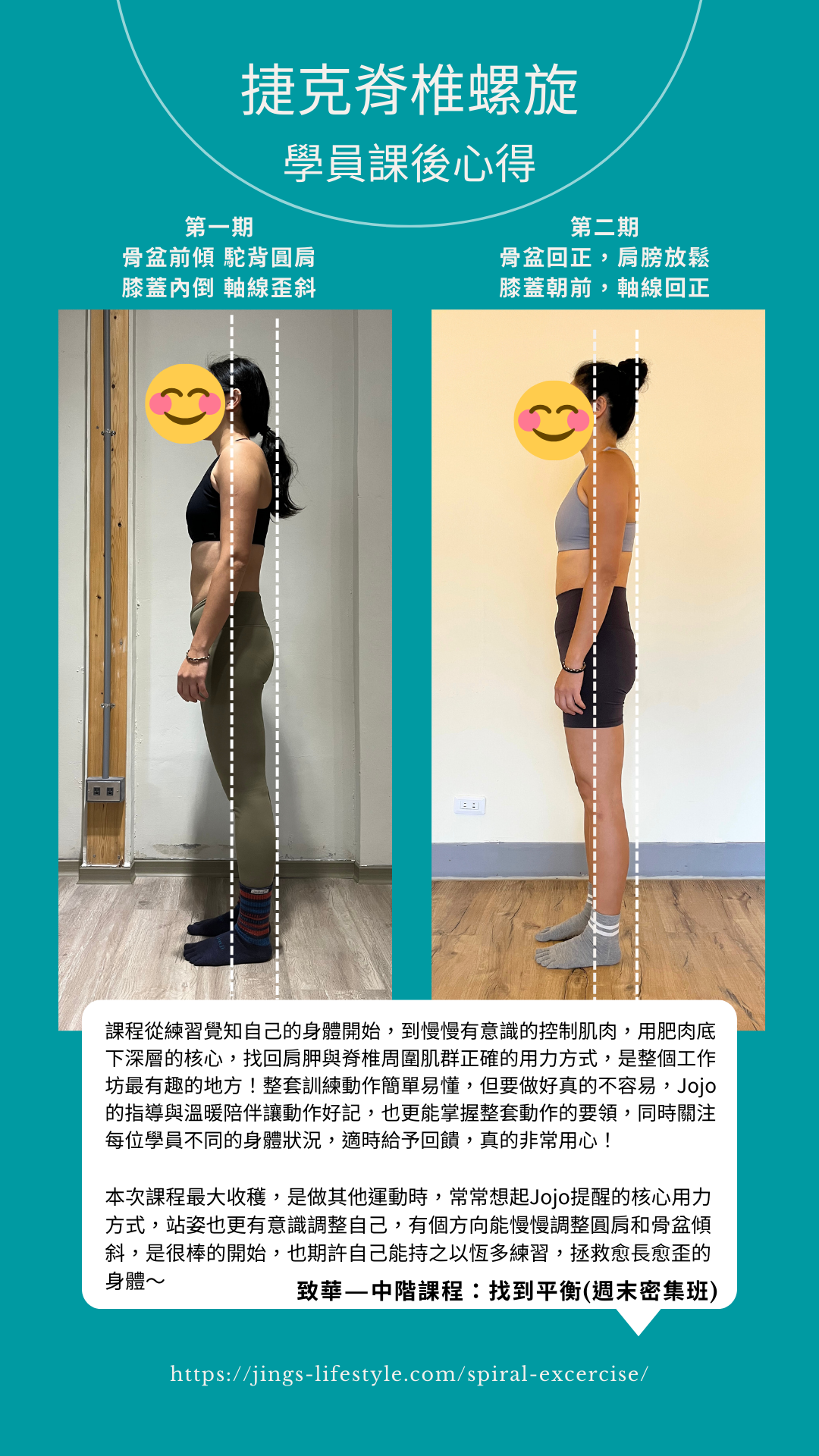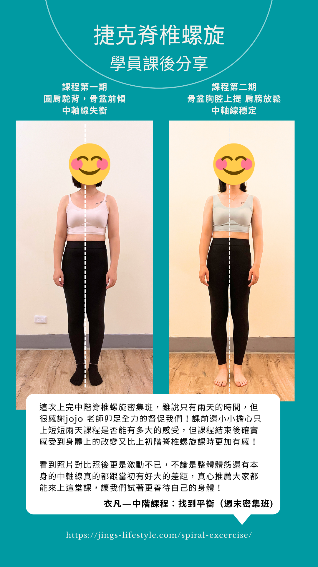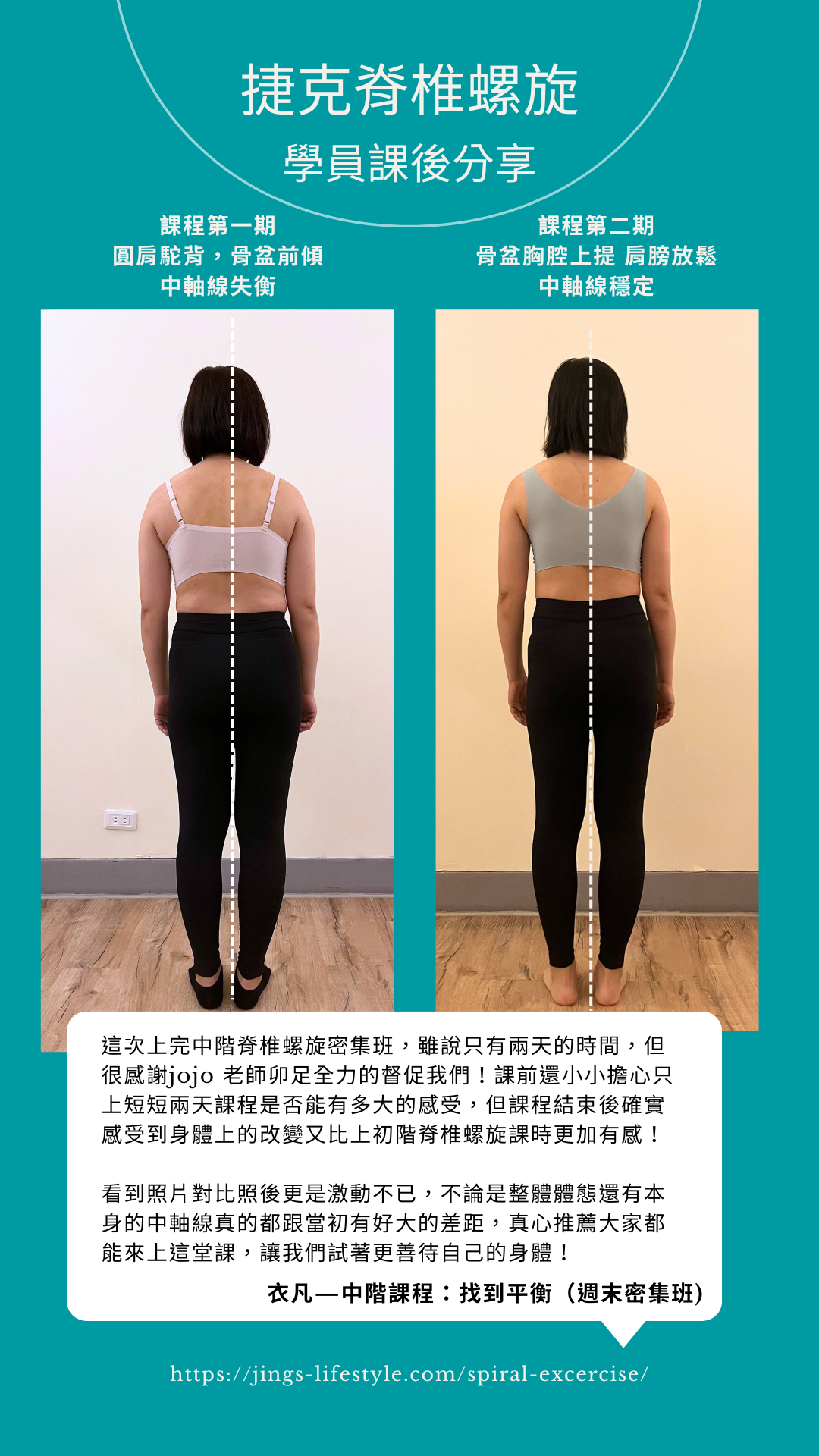 這次上完中階脊椎螺旋密集班,雖說只有兩天的時間,但很感謝jojo 老師卯足全力的督促我們! 課前還小小擔心只上短短兩天課程是否能有多大的感受,但課程結束後確實感受到身體上的改變又比上初階脊椎螺旋課時更加有感! 看到照片對比照後更是激動不已,不論是整體體態還有本身的中軸線真的都跟當初有好大的差距,真心推薦大家都能來上這堂課,讓我們試著更善待自己的身體!