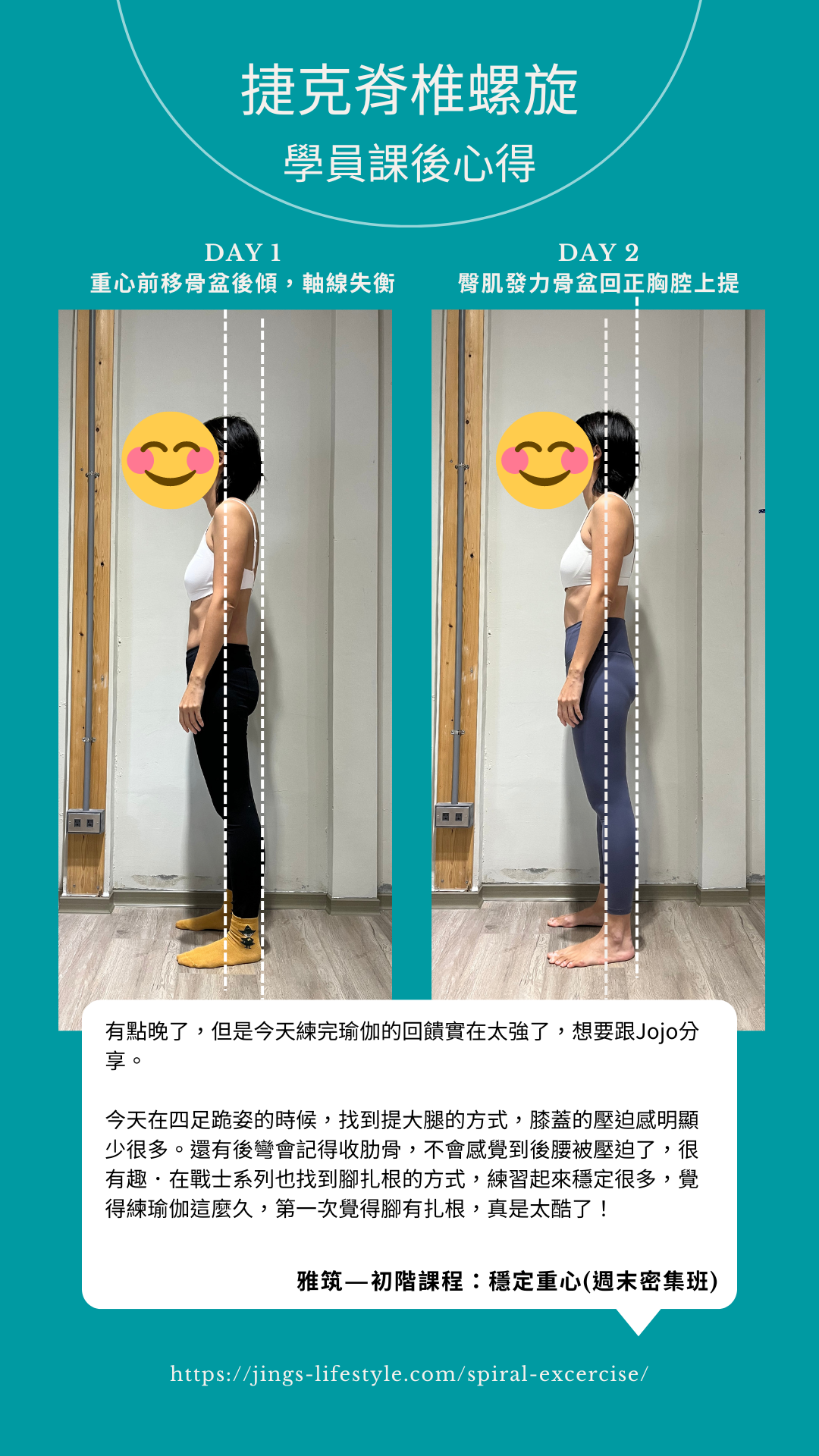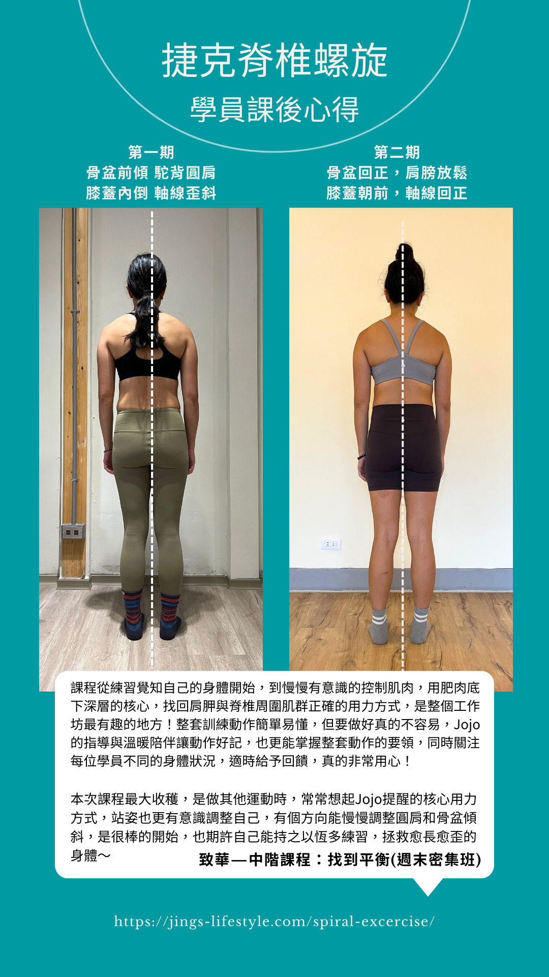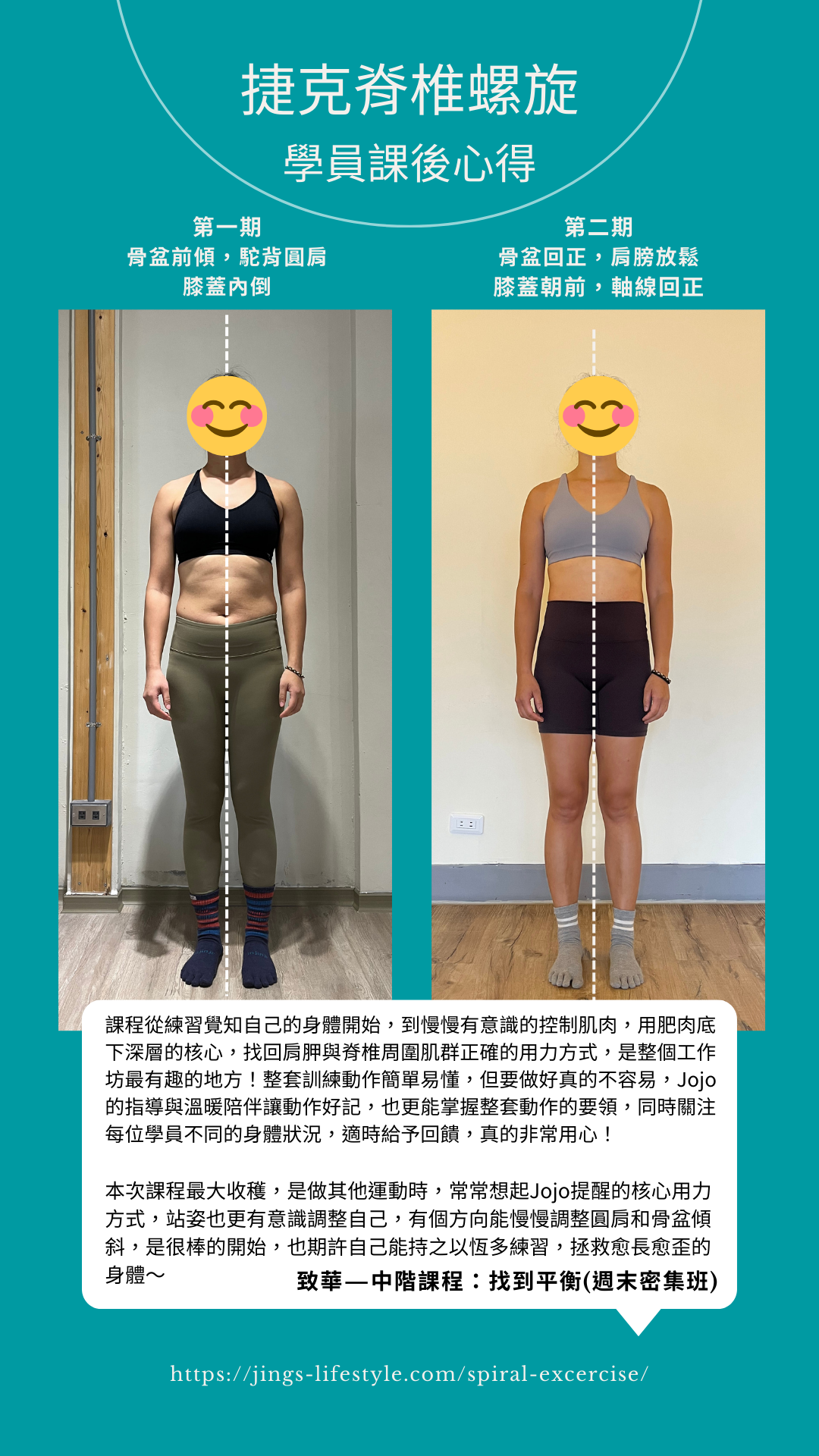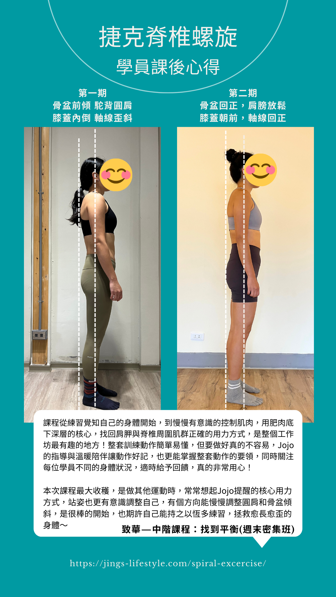 這次上完中階脊椎螺旋密集班,雖說只有兩天的時間,但很感謝jojo 老師卯足全力的督促我們! 課前還小小擔心只上短短兩天課程是否能有多大的感受,但課程結束後確實感受到身體上的改變又比上初階脊椎螺旋課時更加有感! 看到照片對比照後更是激動不已,不論是整體體態還有本身的中軸線真的都跟當初有好大的差距,真心推薦大家都能來上這堂課,讓我們試著更善待自己的身體!