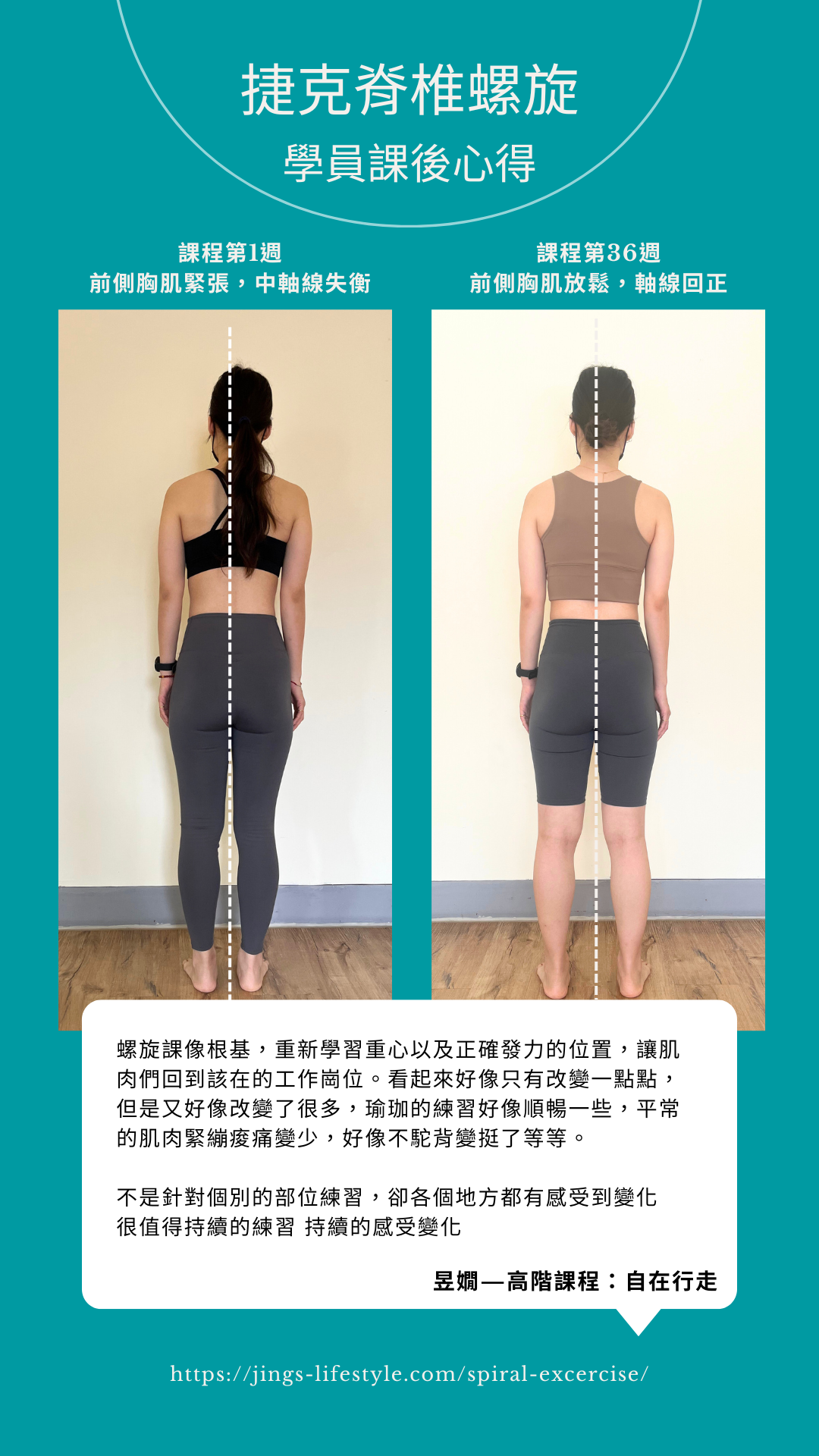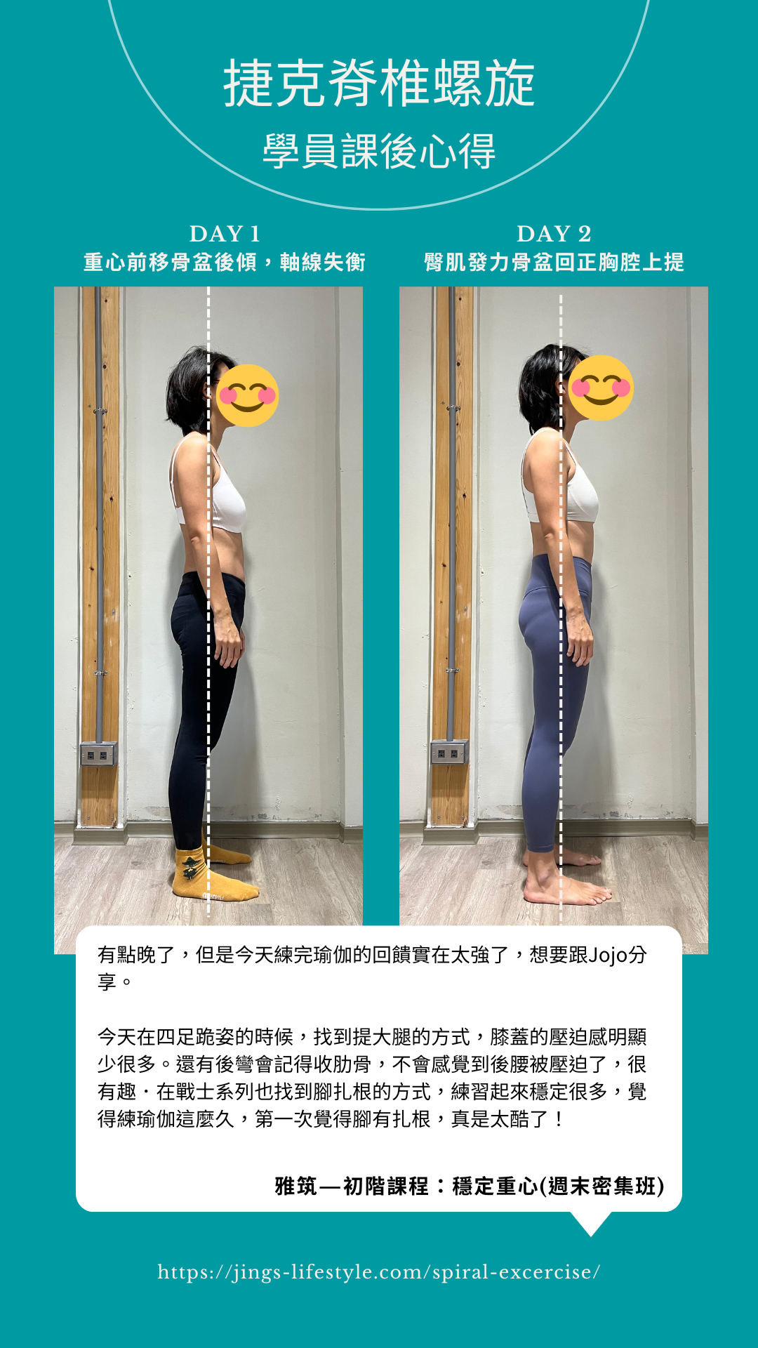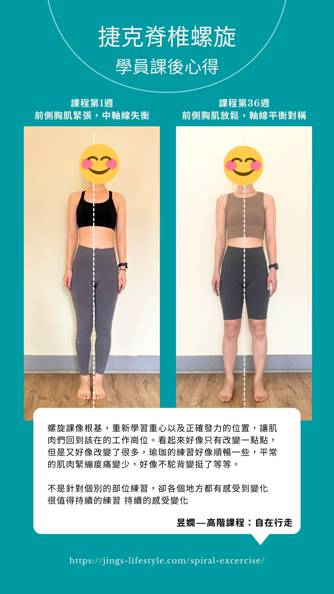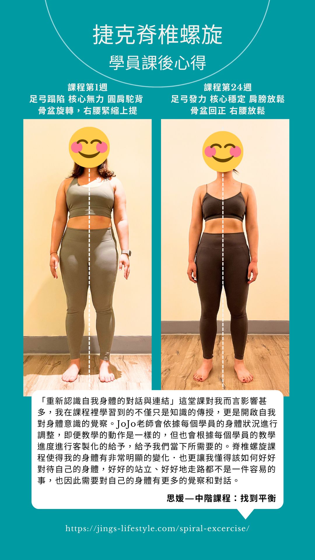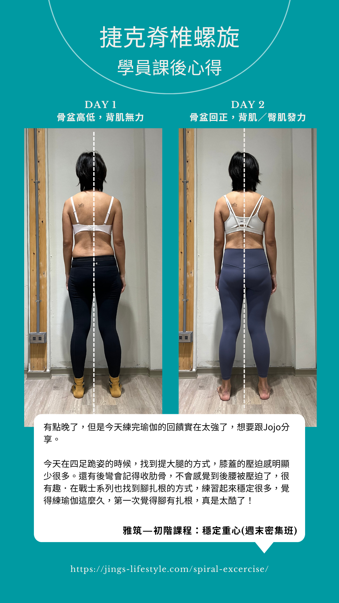 這次上完中階脊椎螺旋密集班,雖說只有兩天的時間,但很感謝jojo 老師卯足全力的督促我們! 課前還小小擔心只上短短兩天課程是否能有多大的感受,但課程結束後確實感受到身體上的改變又比上初階脊椎螺旋課時更加有感! 看到照片對比照後更是激動不已,不論是整體體態還有本身的中軸線真的都跟當初有好大的差距,真心推薦大家都能來上這堂課,讓我們試著更善待自己的身體!