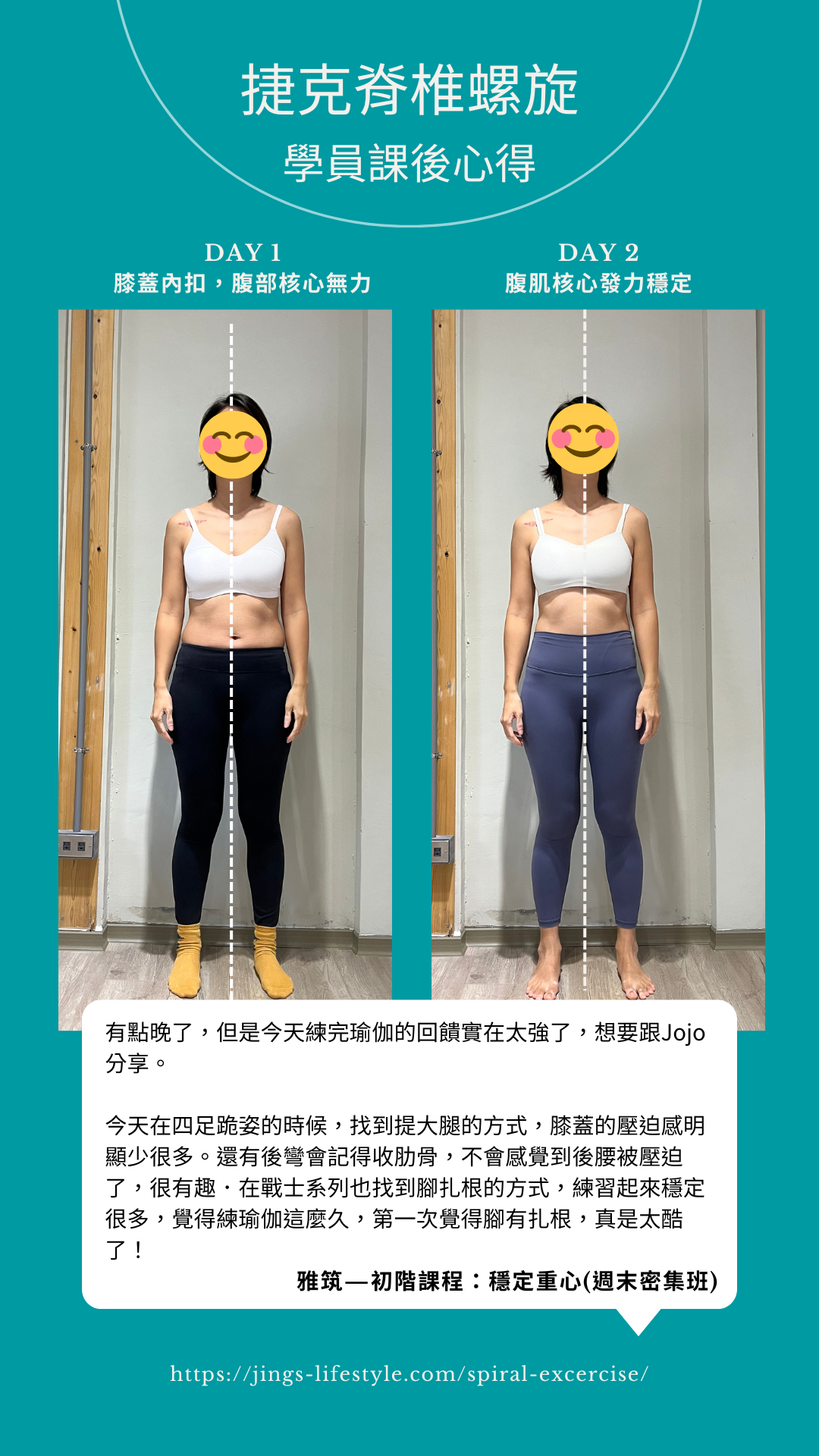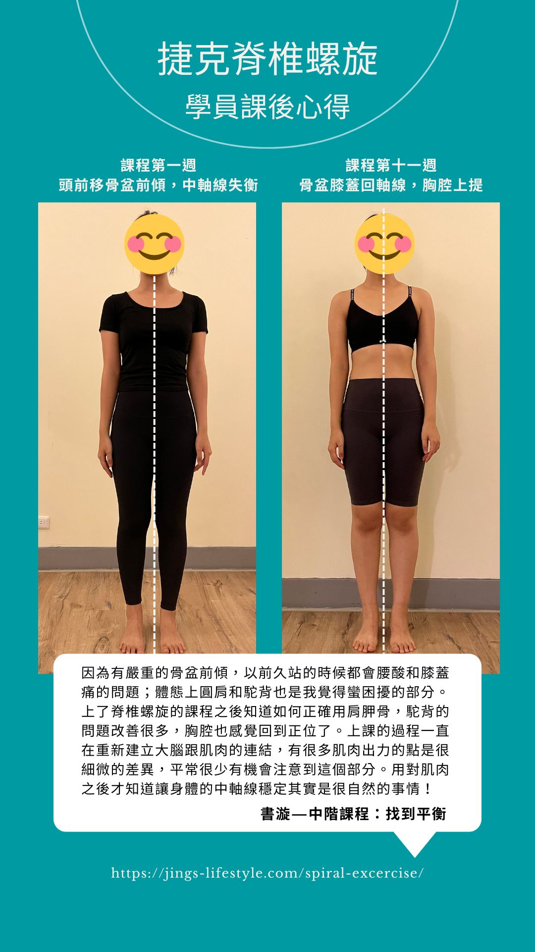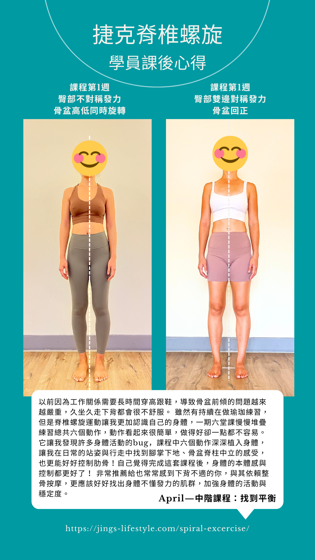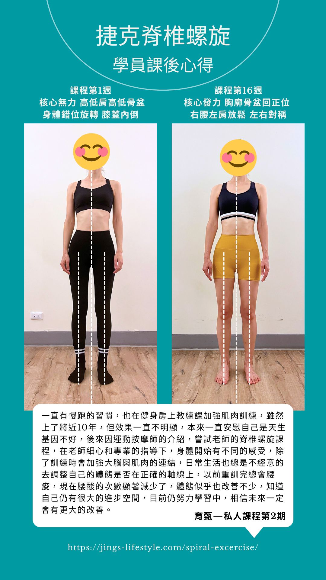 這次上完中階脊椎螺旋密集班,雖說只有兩天的時間,但很感謝jojo 老師卯足全力的督促我們! 課前還小小擔心只上短短兩天課程是否能有多大的感受,但課程結束後確實感受到身體上的改變又比上初階脊椎螺旋課時更加有感! 看到照片對比照後更是激動不已,不論是整體體態還有本身的中軸線真的都跟當初有好大的差距,真心推薦大家都能來上這堂課,讓我們試著更善待自己的身體!