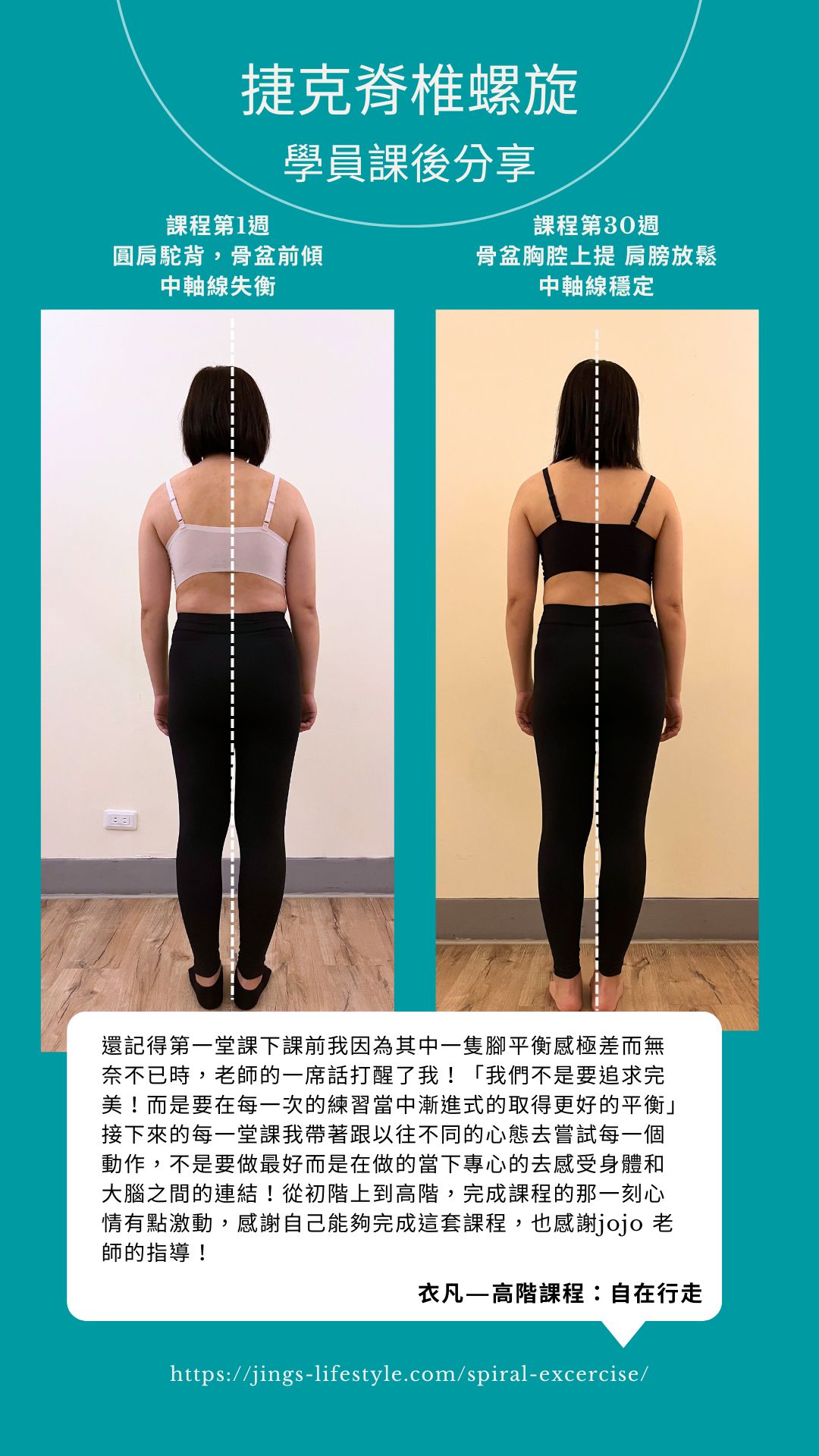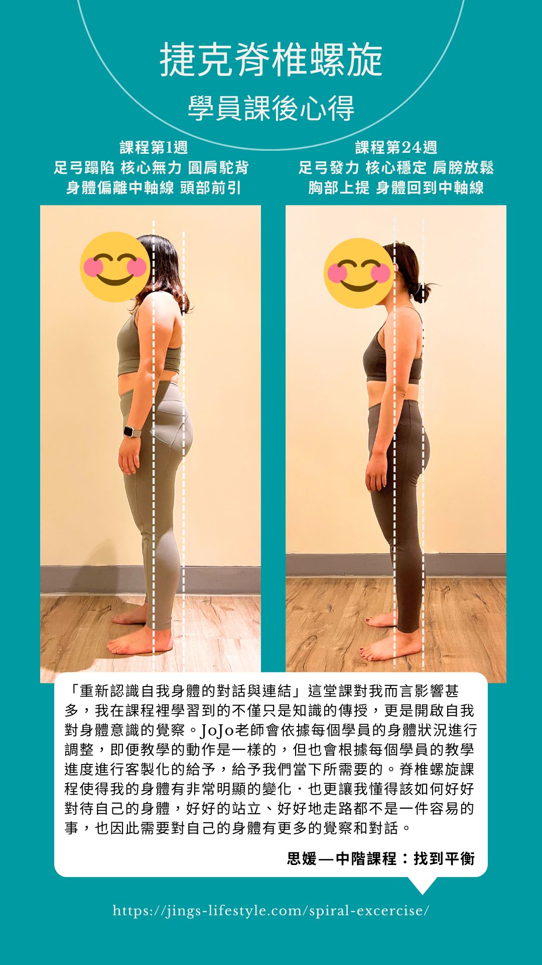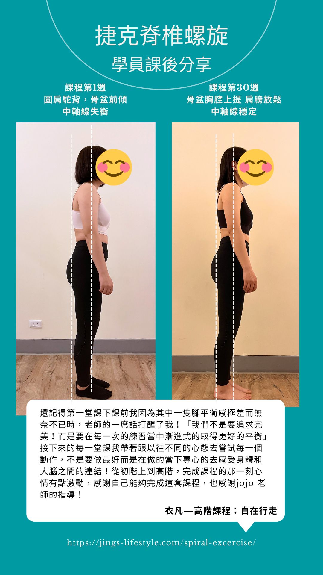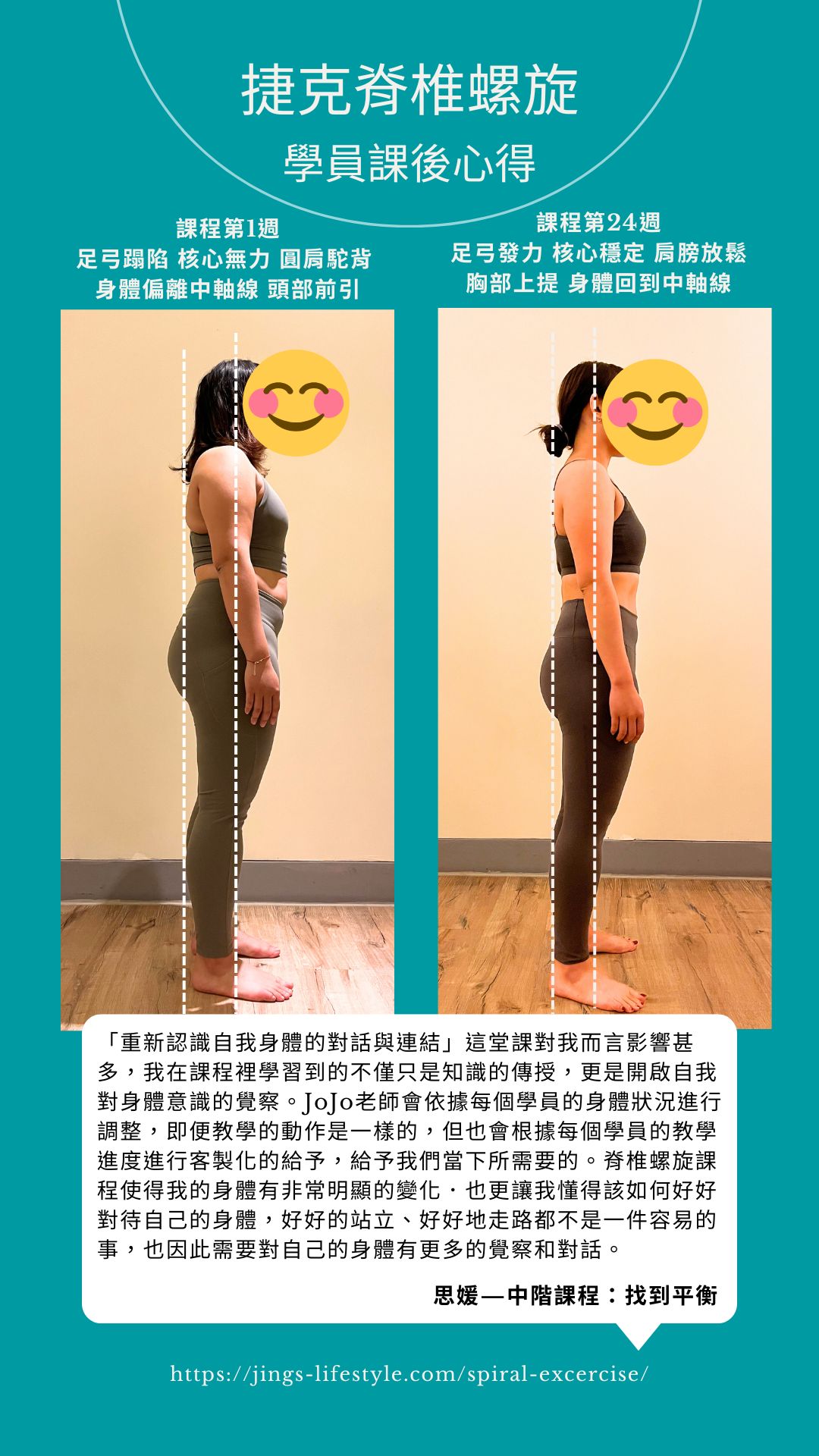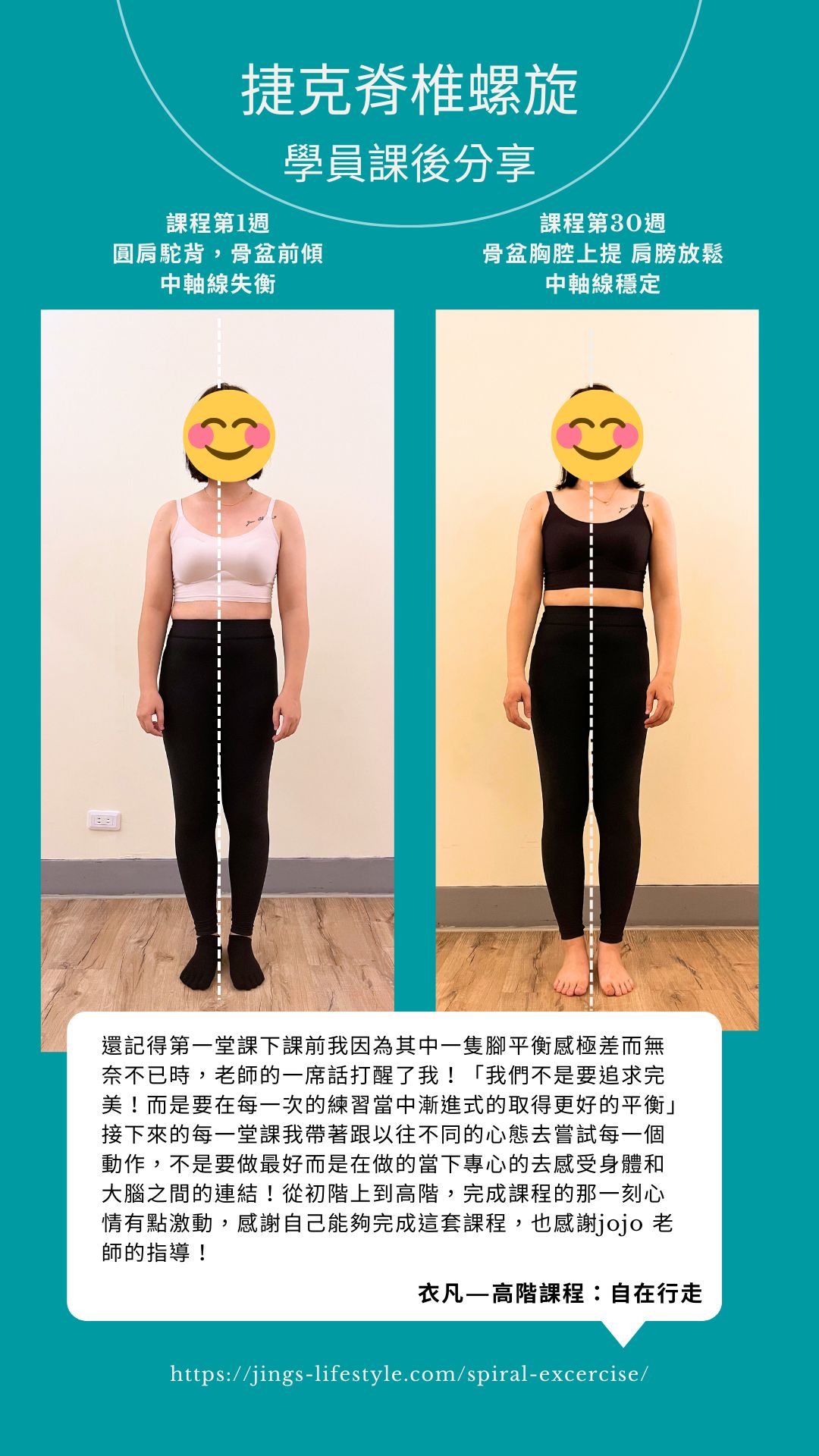 這次上完中階脊椎螺旋密集班,雖說只有兩天的時間,但很感謝jojo 老師卯足全力的督促我們! 課前還小小擔心只上短短兩天課程是否能有多大的感受,但課程結束後確實感受到身體上的改變又比上初階脊椎螺旋課時更加有感! 看到照片對比照後更是激動不已,不論是整體體態還有本身的中軸線真的都跟當初有好大的差距,真心推薦大家都能來上這堂課,讓我們試著更善待自己的身體!