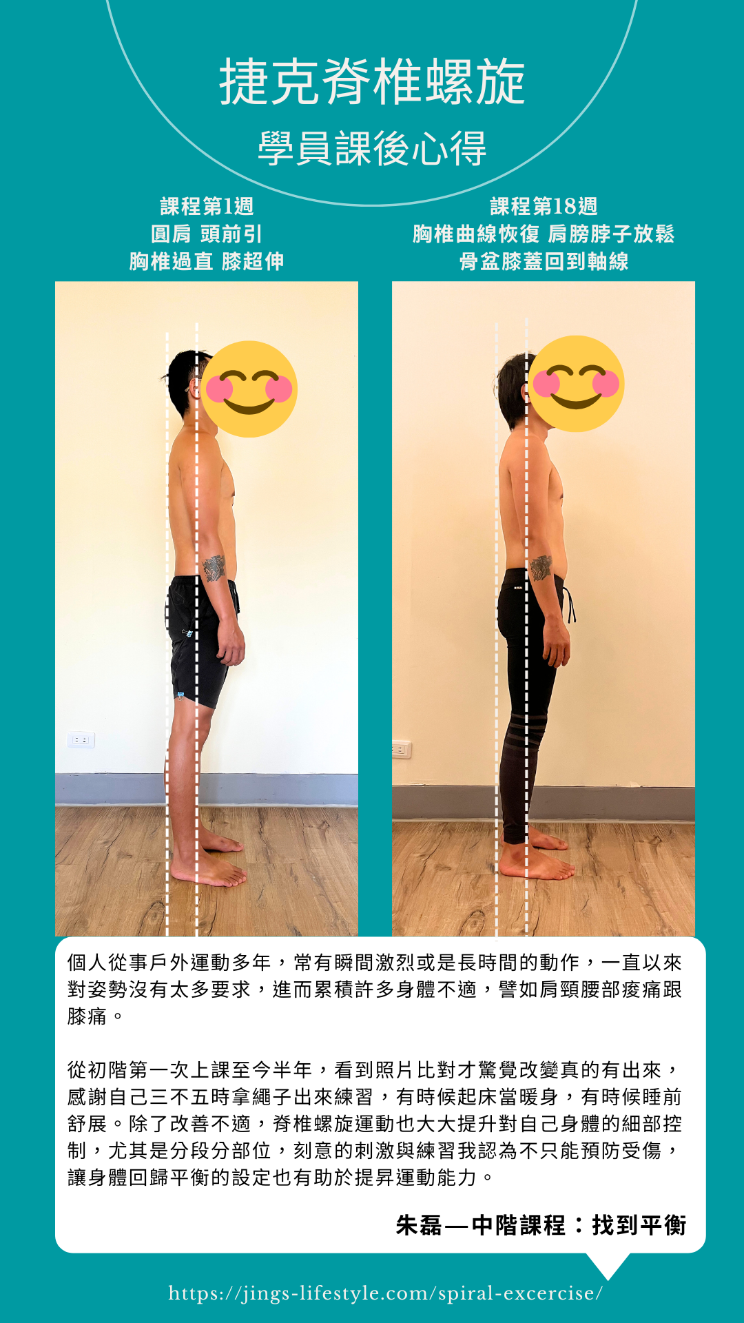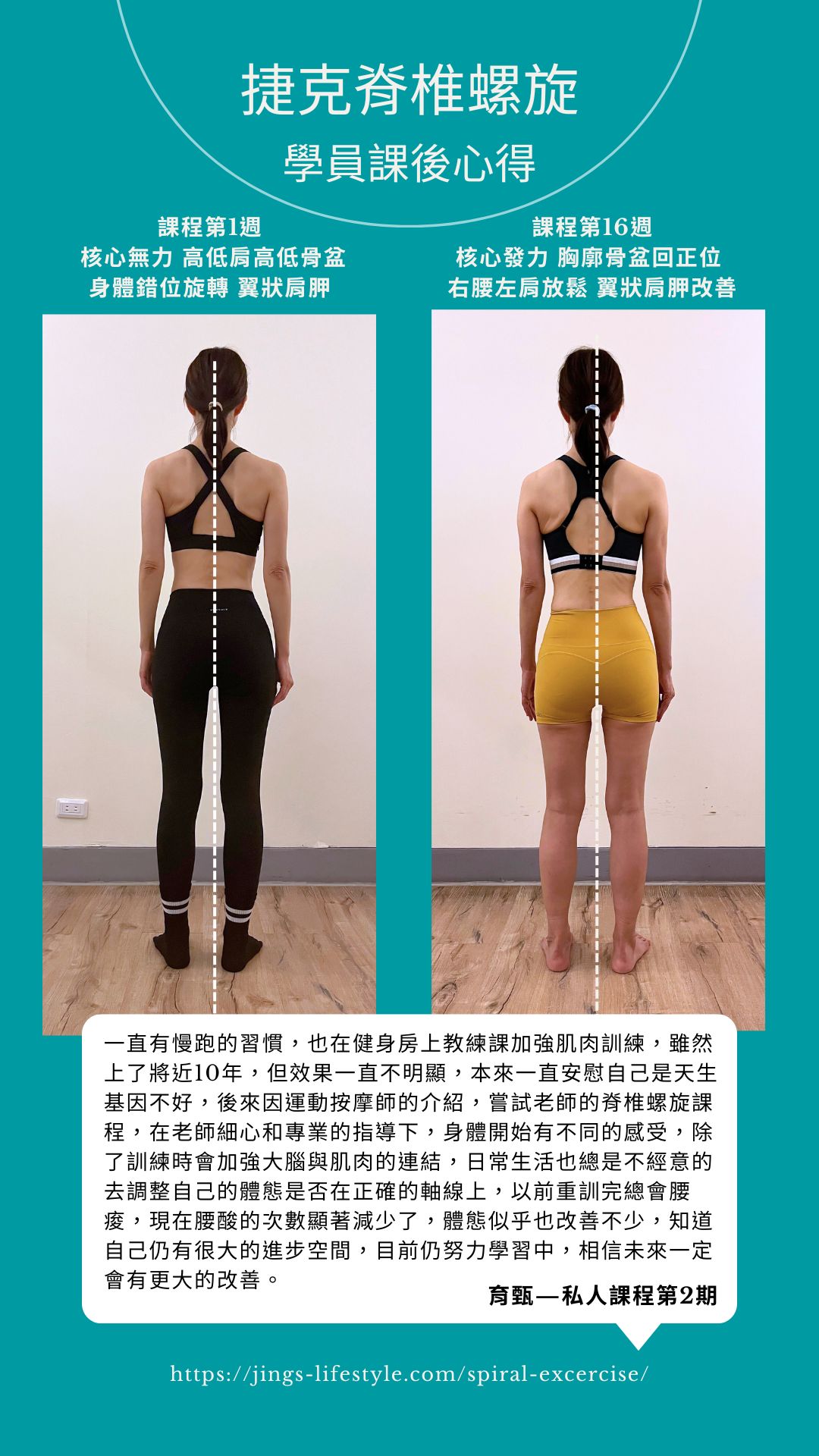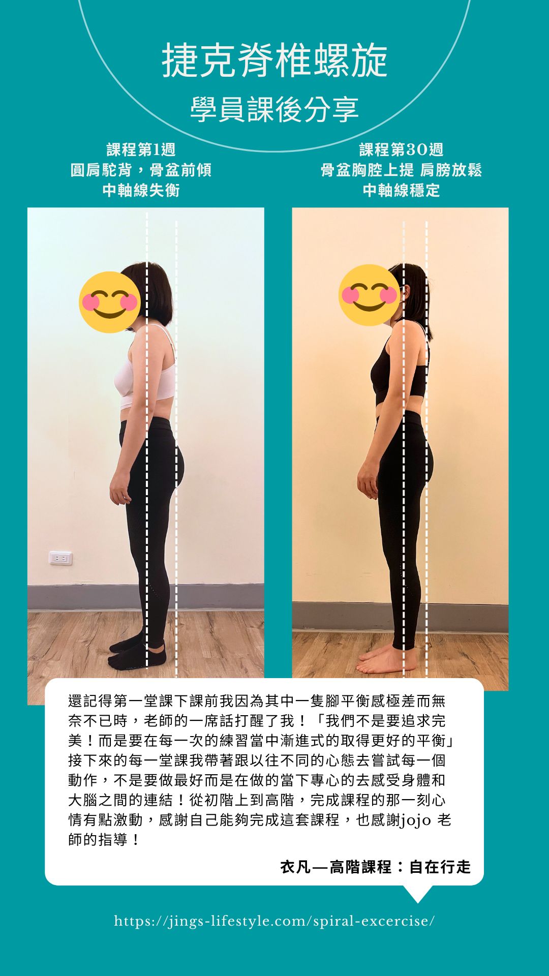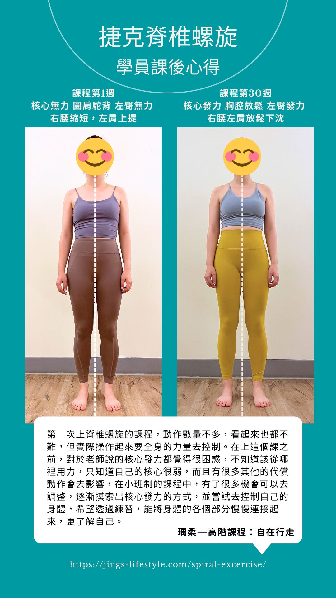 這次上完中階脊椎螺旋密集班,雖說只有兩天的時間,但很感謝jojo 老師卯足全力的督促我們! 課前還小小擔心只上短短兩天課程是否能有多大的感受,但課程結束後確實感受到身體上的改變又比上初階脊椎螺旋課時更加有感! 看到照片對比照後更是激動不已,不論是整體體態還有本身的中軸線真的都跟當初有好大的差距,真心推薦大家都能來上這堂課,讓我們試著更善待自己的身體!