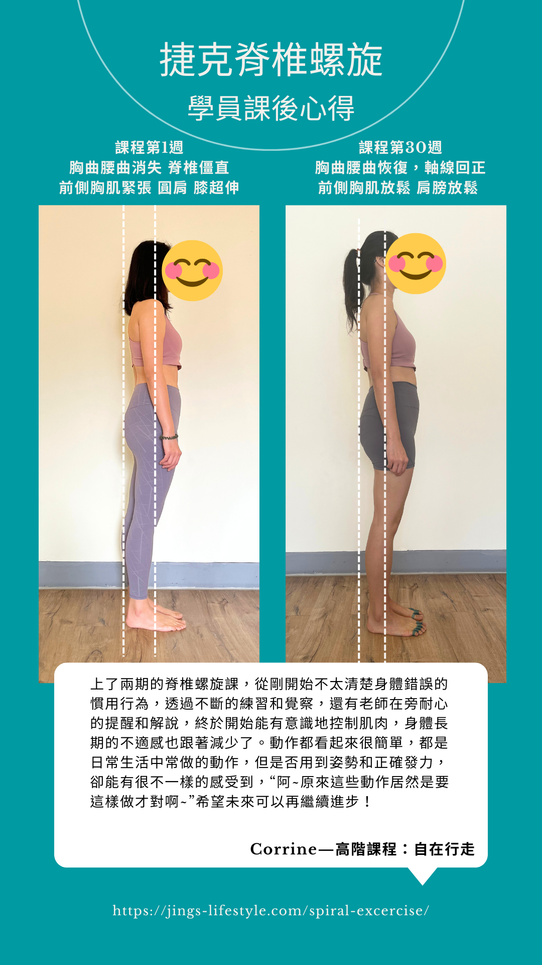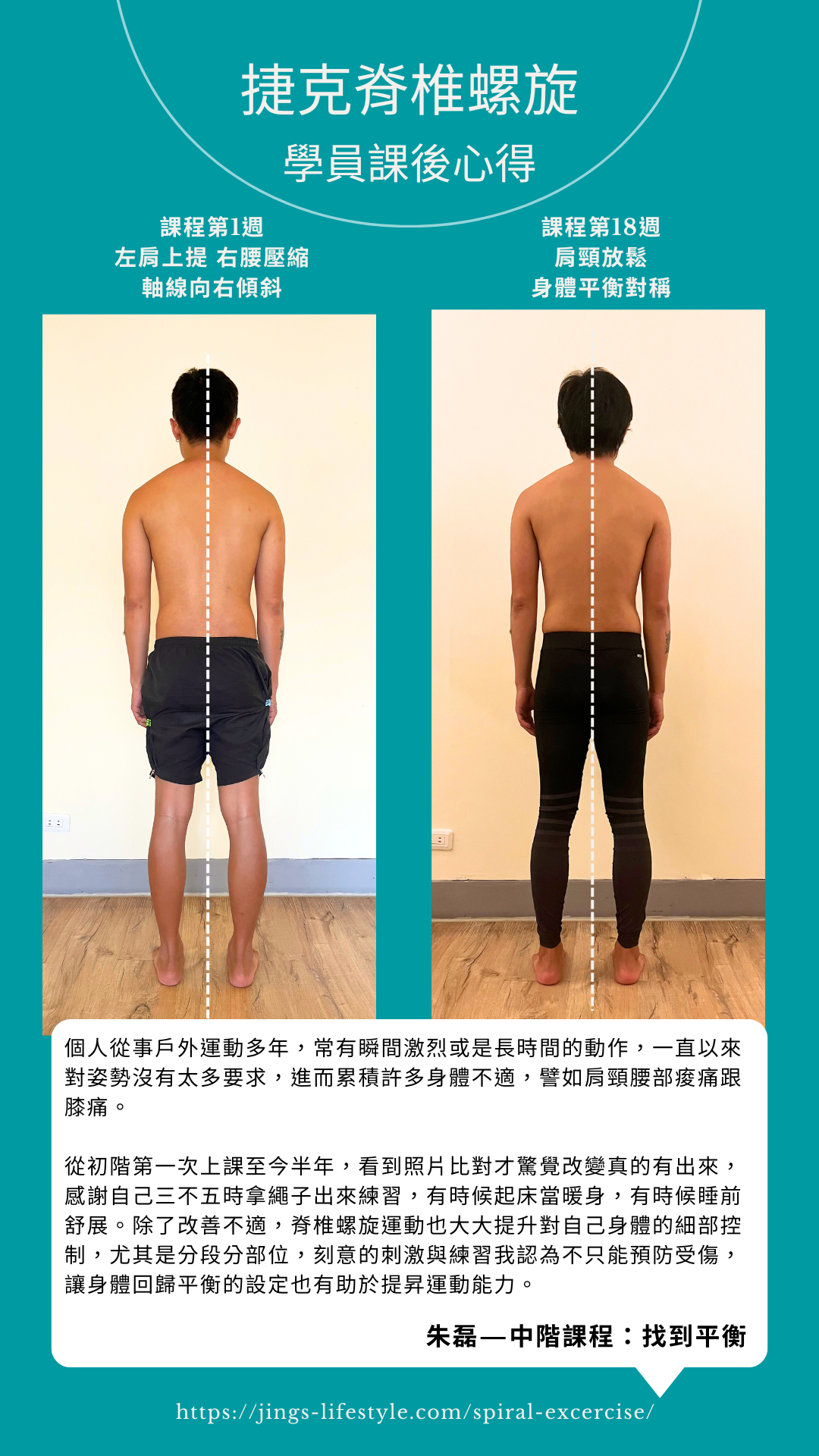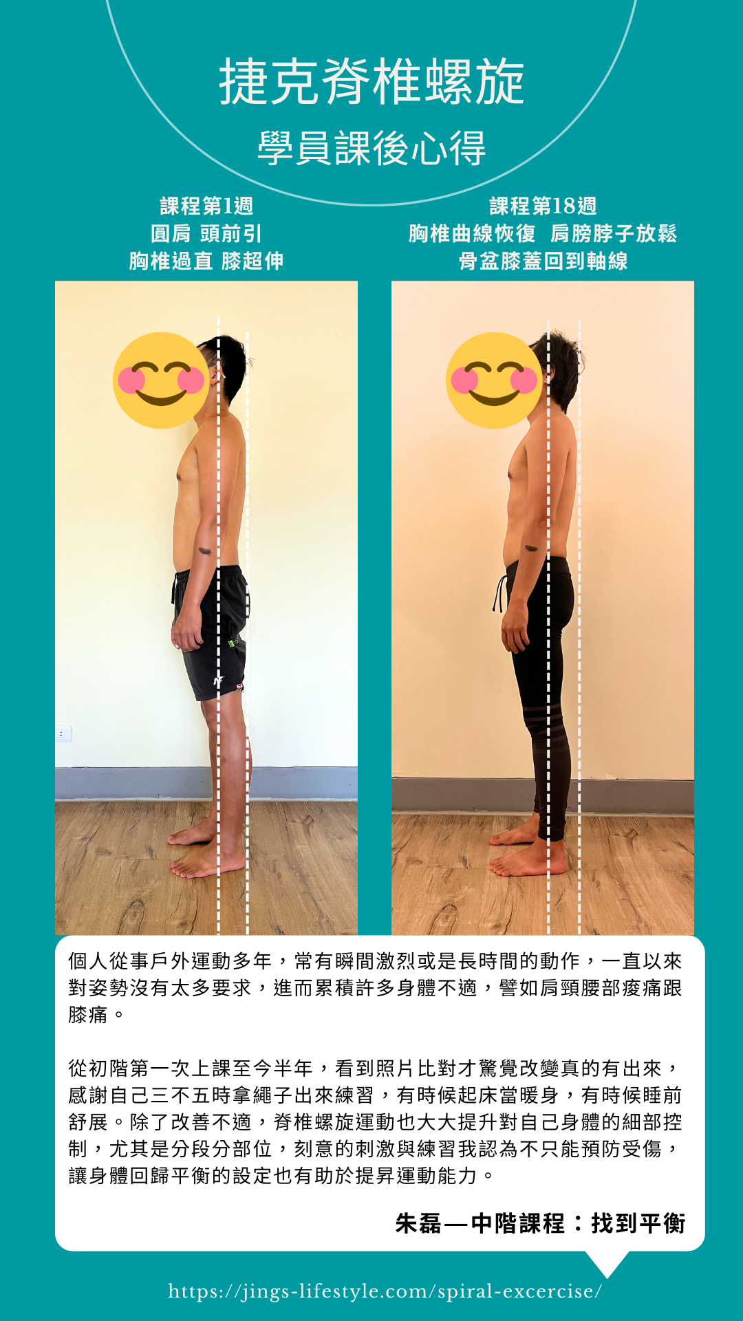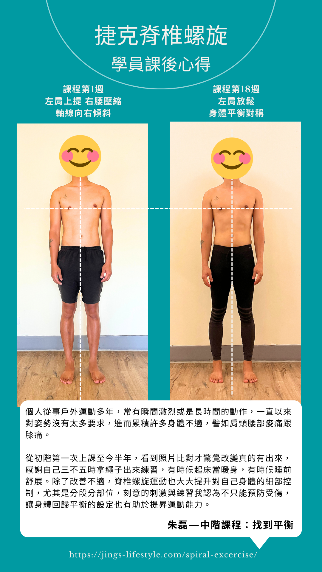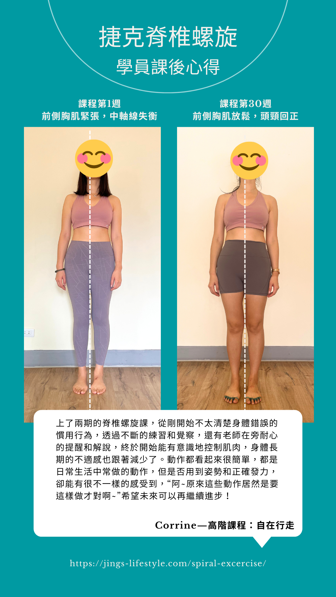 這次上完中階脊椎螺旋密集班,雖說只有兩天的時間,但很感謝jojo 老師卯足全力的督促我們! 課前還小小擔心只上短短兩天課程是否能有多大的感受,但課程結束後確實感受到身體上的改變又比上初階脊椎螺旋課時更加有感! 看到照片對比照後更是激動不已,不論是整體體態還有本身的中軸線真的都跟當初有好大的差距,真心推薦大家都能來上這堂課,讓我們試著更善待自己的身體!