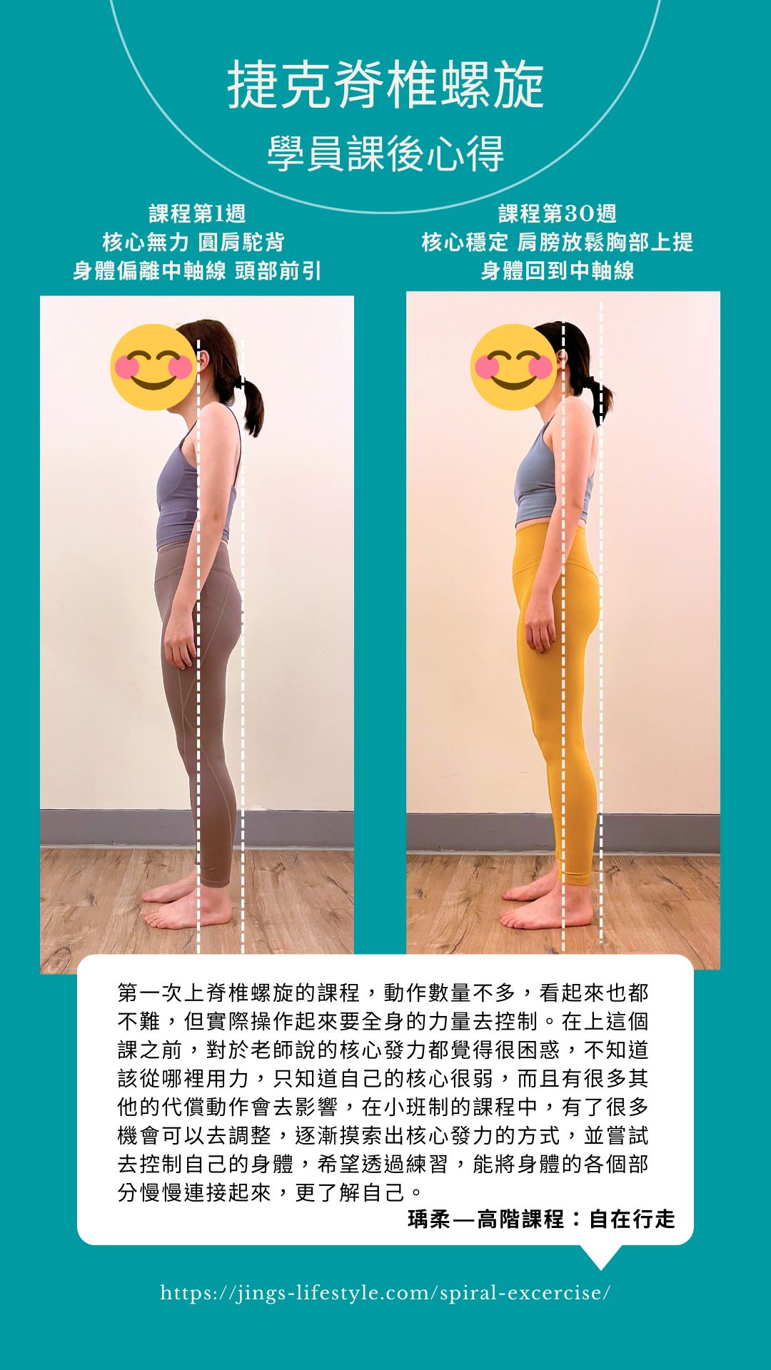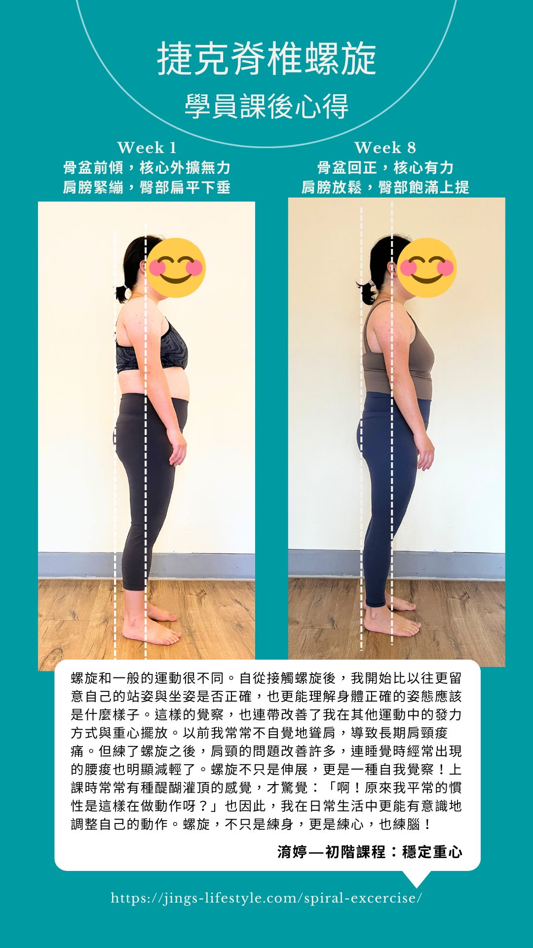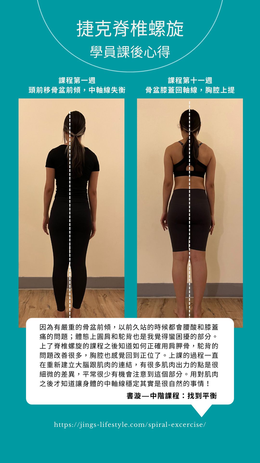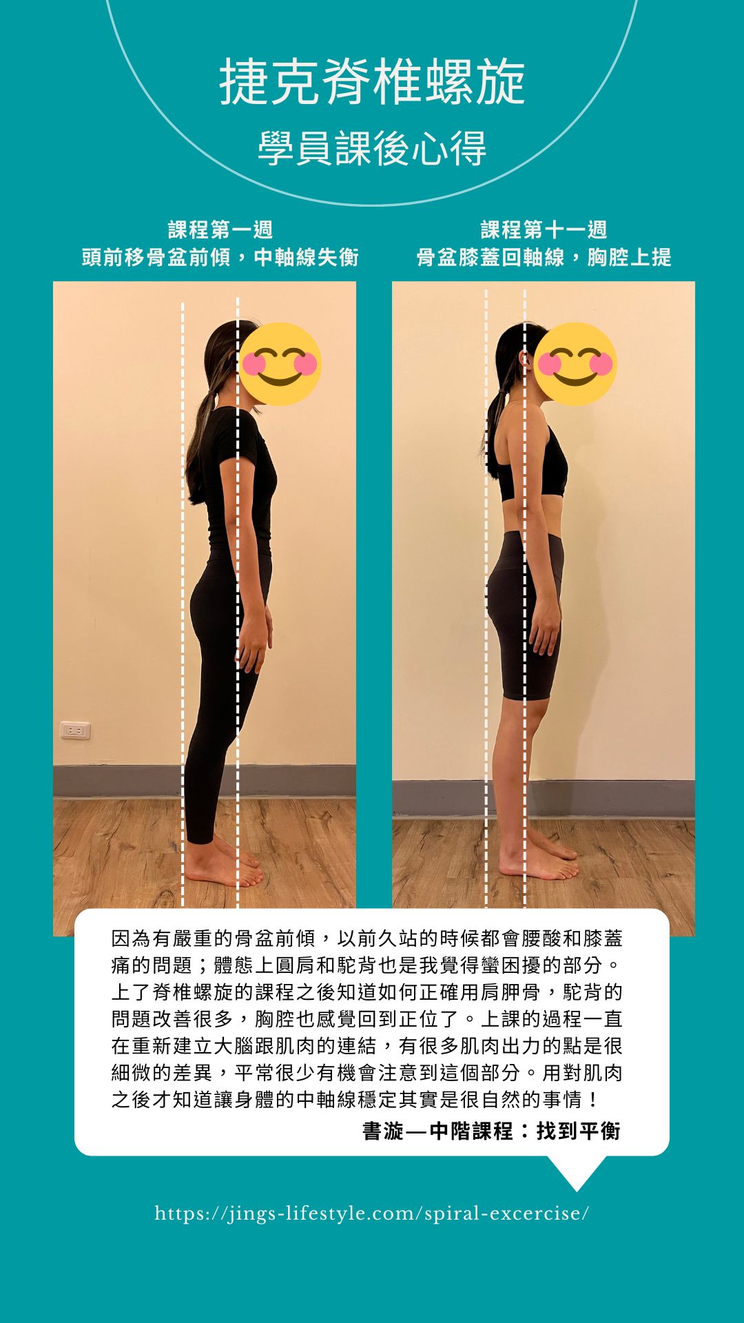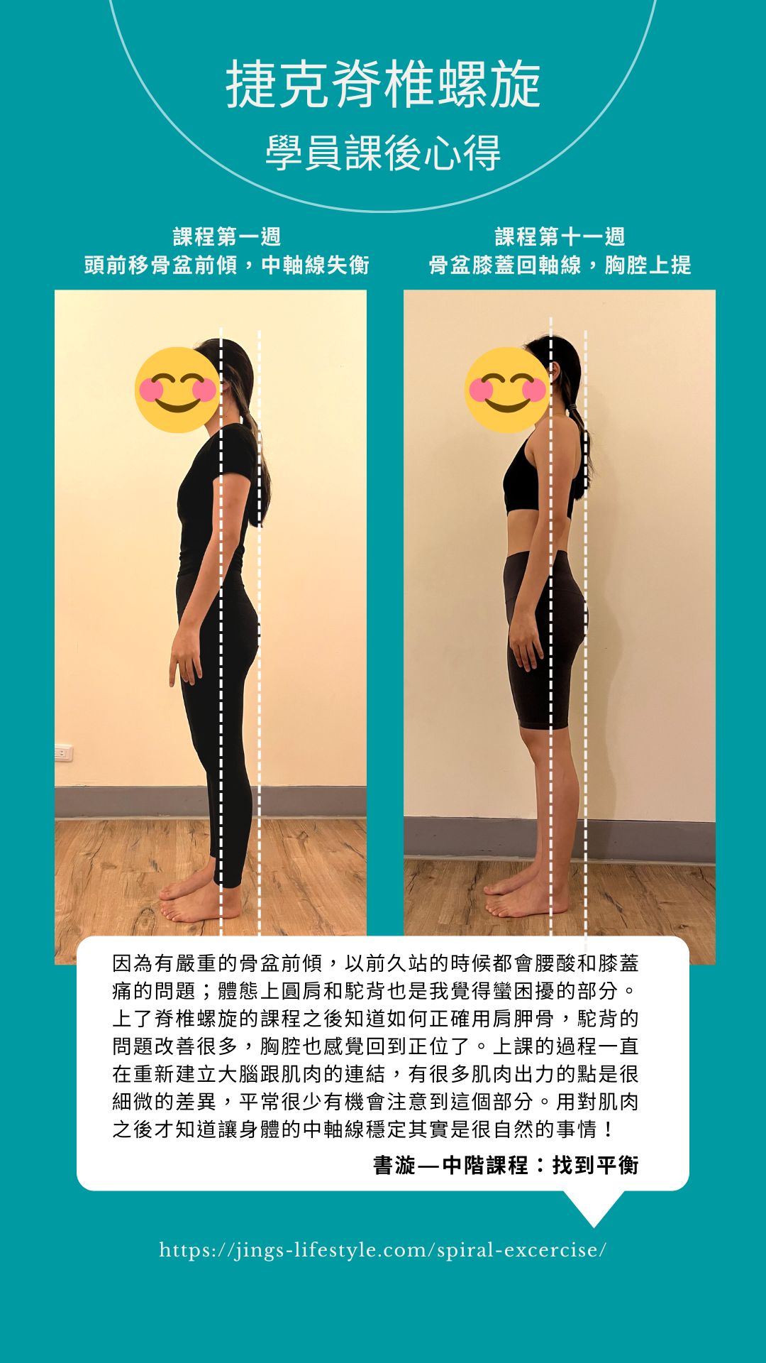 因為有嚴重的骨盆前傾,以前久站的時候都會腰酸和膝蓋痛的問題;體態上圓肩和駝背也是我覺得蠻困擾的部分。上了脊椎螺旋的課程之後知道如何正確用肩胛骨,駝背的問題改善很多,胸腔也感覺回到正位了。在訓練核心的時候才發現自己以前其實都沒有正確的用核心發力過,上課的過程一直在重新建立大腦跟肌肉的連結,有很多肌肉出力的點是很細微的差異,平常很少有機會注意到這個部分。用對肌肉之後才知道讓身體的中軸線穩定其實是很自然的事情,現在站著的時候會一直提醒自己要把肩胛骨夾緊、肋骨往內縮、屁股出力,基本上已經不太會腰酸背痛和膝蓋痛了。上完初階的課程之後身體狀態和以前差很多,學會穩定核心的力量讓我在日常生活和做其他運動的時候都更輕鬆,原本垂垂的屁股也變得比較有力了!