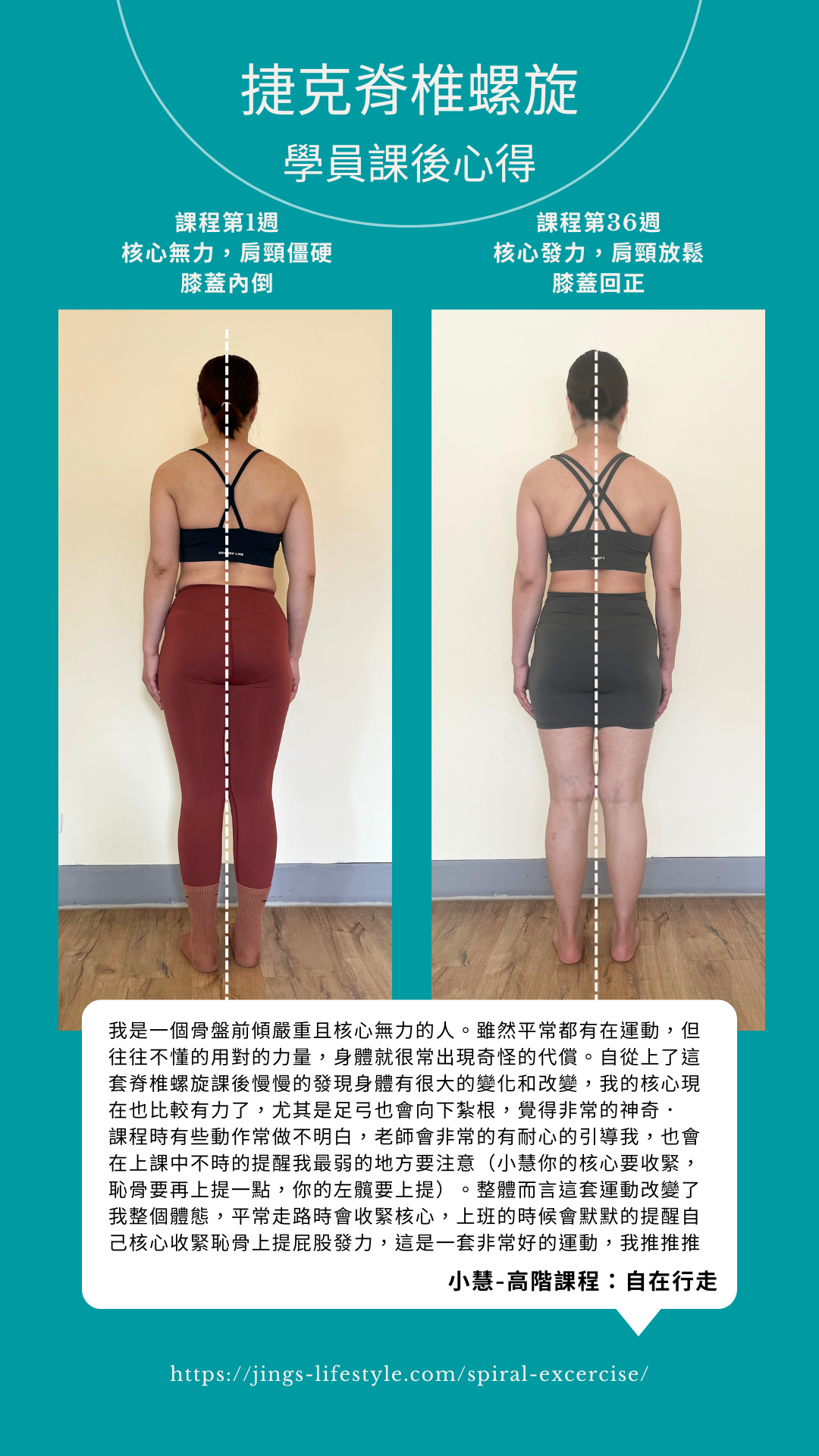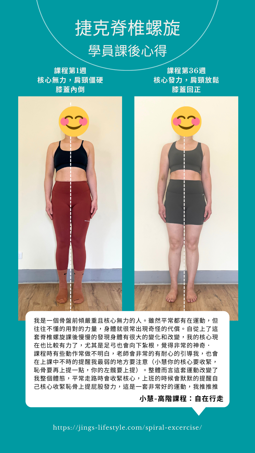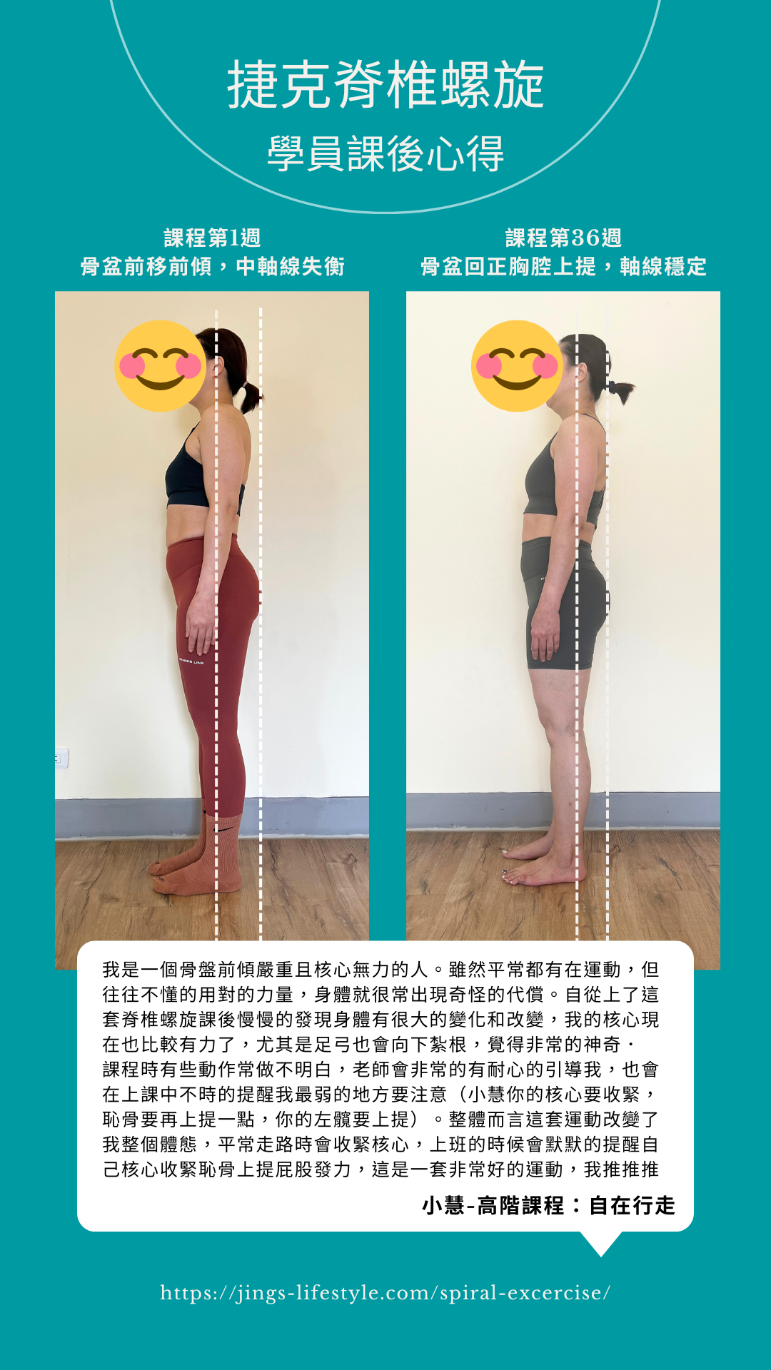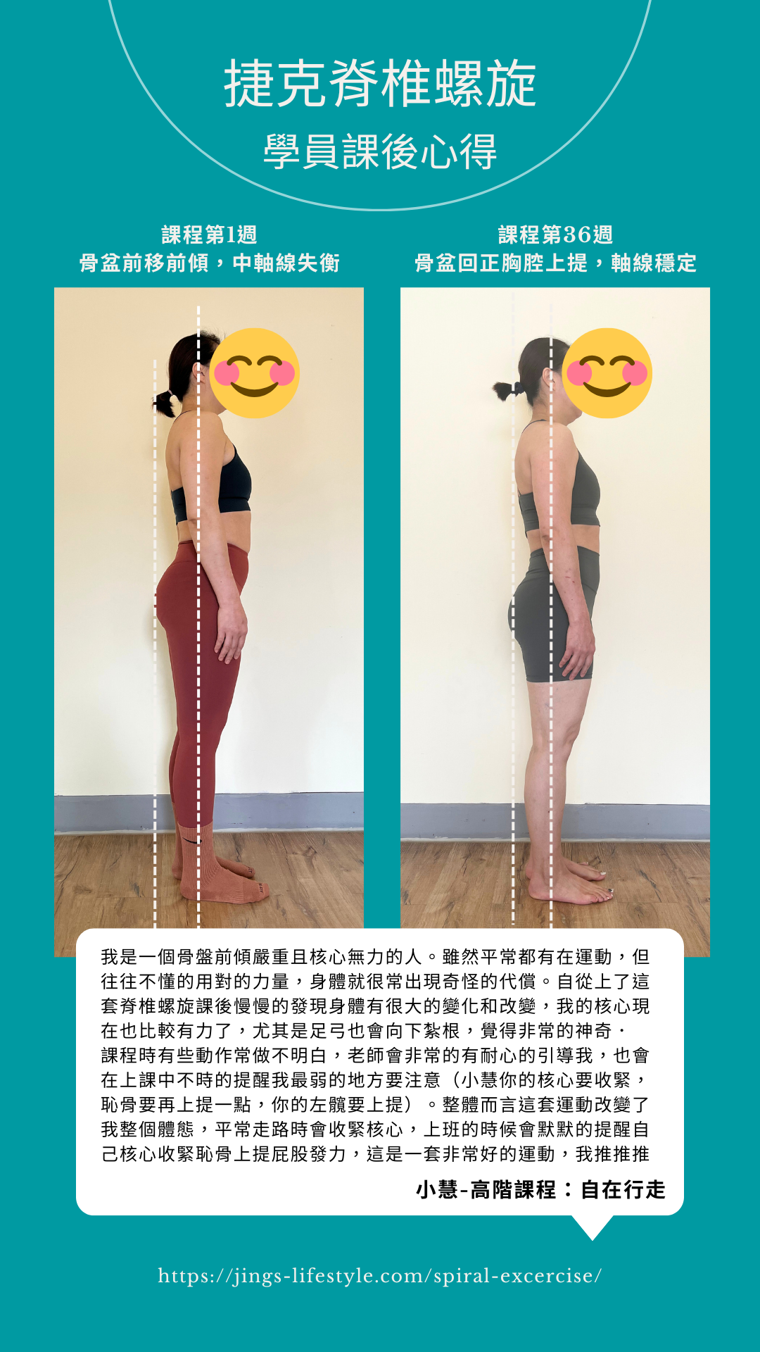 我本身就是屬於一個骨盤前傾很嚴重再加上核心沒力的人還有就是沒足弓,雖然平常就有在運動但往往不懂的用對的力量發力身體就很常出現奇怪的代償。 自從上了這套脊椎螺旋課後慢慢的發現身體有很大的變化和改變,尤其是看了老師幫我們紀錄的照片後才知道矯正了這麼多,記得我以前每次在做腰貼牆的這個動作我的腰都無法貼牆腰後會出現很大的空隙,無論自己很努力的喬就是沒辦法很貼牆,有天突然靠牆試看看沒想到竟然比之前還貼牆而且是不用很出力的那種,我的核心現在也比較有力了,尤其是足弓也比較會發力了,我自己都覺得非常的神奇 有時候有些動作常做不明白,老師會非常的有耐心的引導我也會在上課中不時的提醒我最弱的地方要注意(小慧你的核心要收緊,恥骨要在上提一點,你的左髖要在上提)😆😆 整體而言這套運動改變了我整個體態、平常走路時會抬頭挺胸、上班的時候會默默的提醒自己核心收緊恥骨上提屁股發力,這是一套非常好的運動我推推推👍