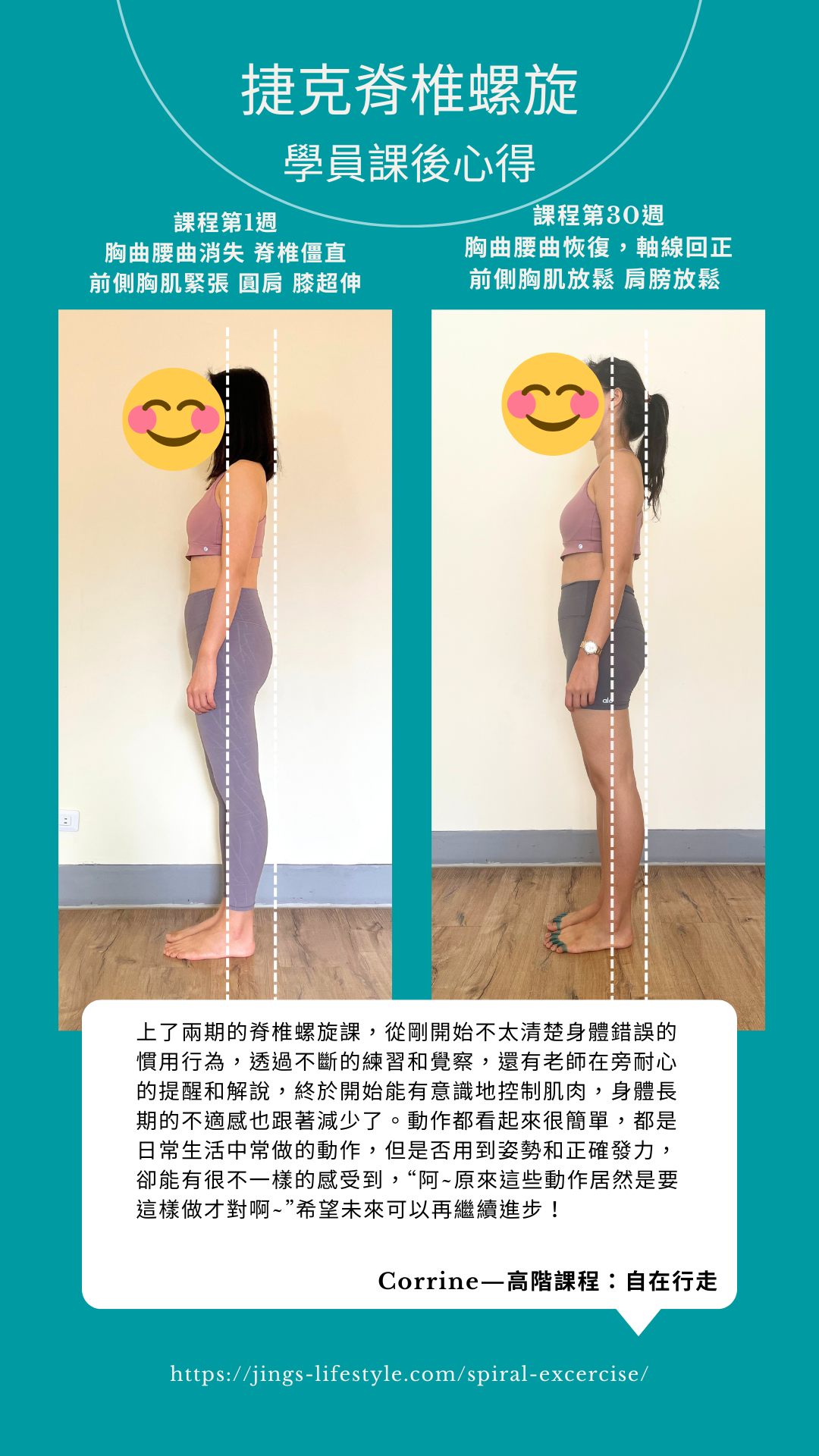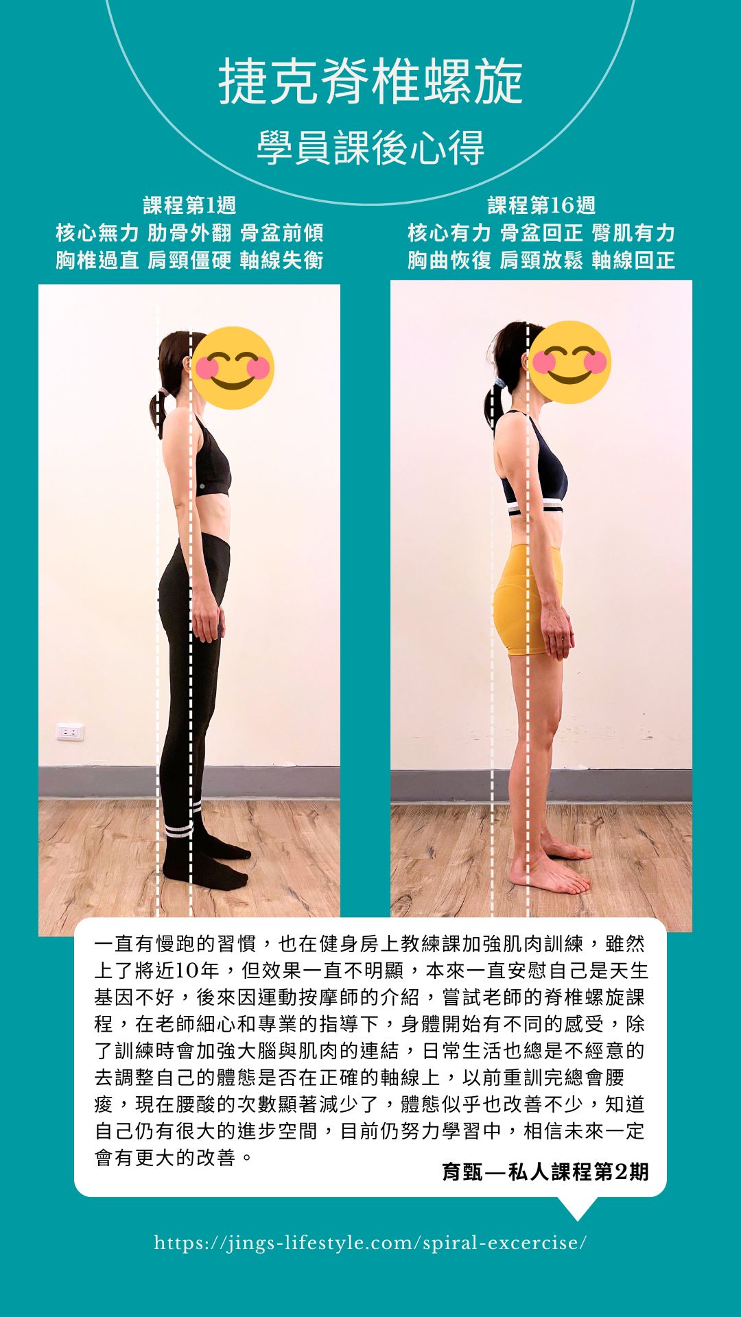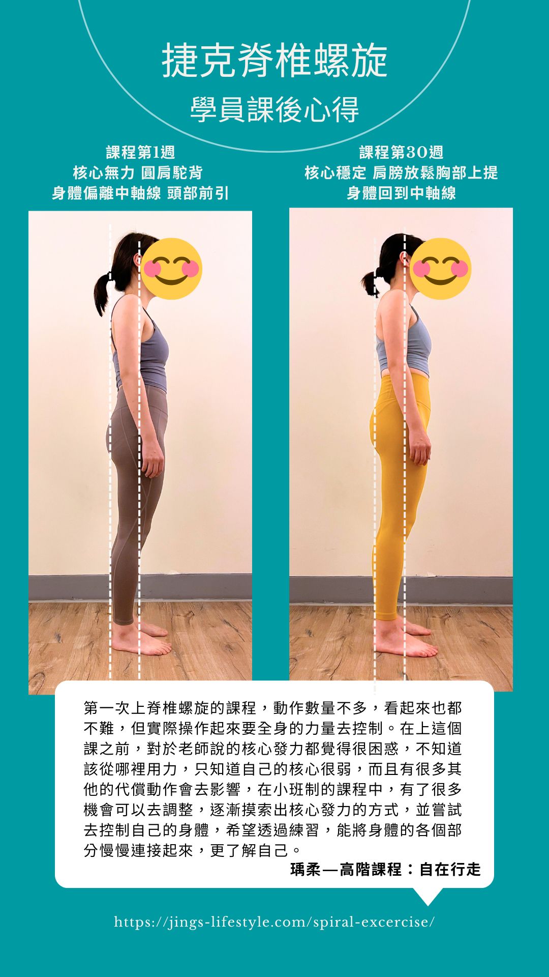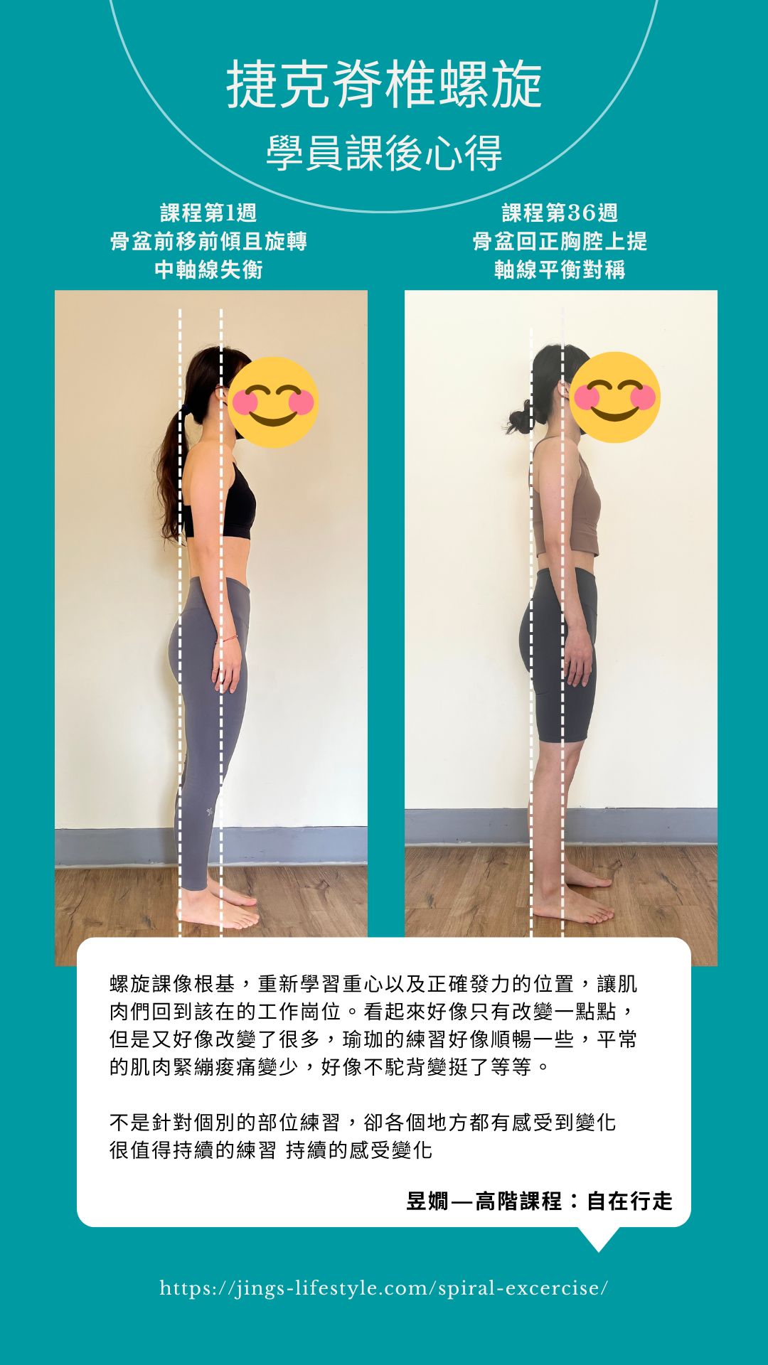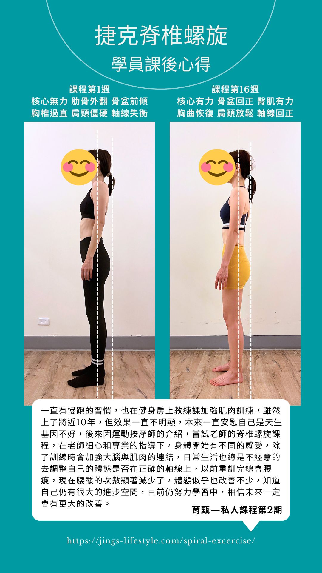 我本身就是屬於一個骨盤前傾很嚴重再加上核心沒力的人還有就是沒足弓,雖然平常就有在運動但往往不懂的用對的力量發力身體就很常出現奇怪的代償。 自從上了這套脊椎螺旋課後慢慢的發現身體有很大的變化和改變,尤其是看了老師幫我們紀錄的照片後才知道矯正了這麼多,記得我以前每次在做腰貼牆的這個動作我的腰都無法貼牆腰後會出現很大的空隙,無論自己很努力的喬就是沒辦法很貼牆,有天突然靠牆試看看沒想到竟然比之前還貼牆而且是不用很出力的那種,我的核心現在也比較有力了,尤其是足弓也比較會發力了,我自己都覺得非常的神奇 有時候有些動作常做不明白,老師會非常的有耐心的引導我也會在上課中不時的提醒我最弱的地方要注意(小慧你的核心要收緊,恥骨要在上提一點,你的左髖要在上提)😆😆 整體而言這套運動改變了我整個體態、平常走路時會抬頭挺胸、上班的時候會默默的提醒自己核心收緊恥骨上提屁股發力,這是一套非常好的運動我推推推👍