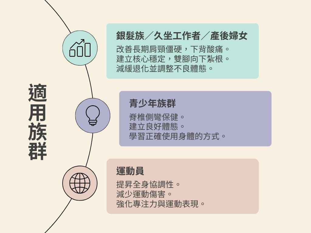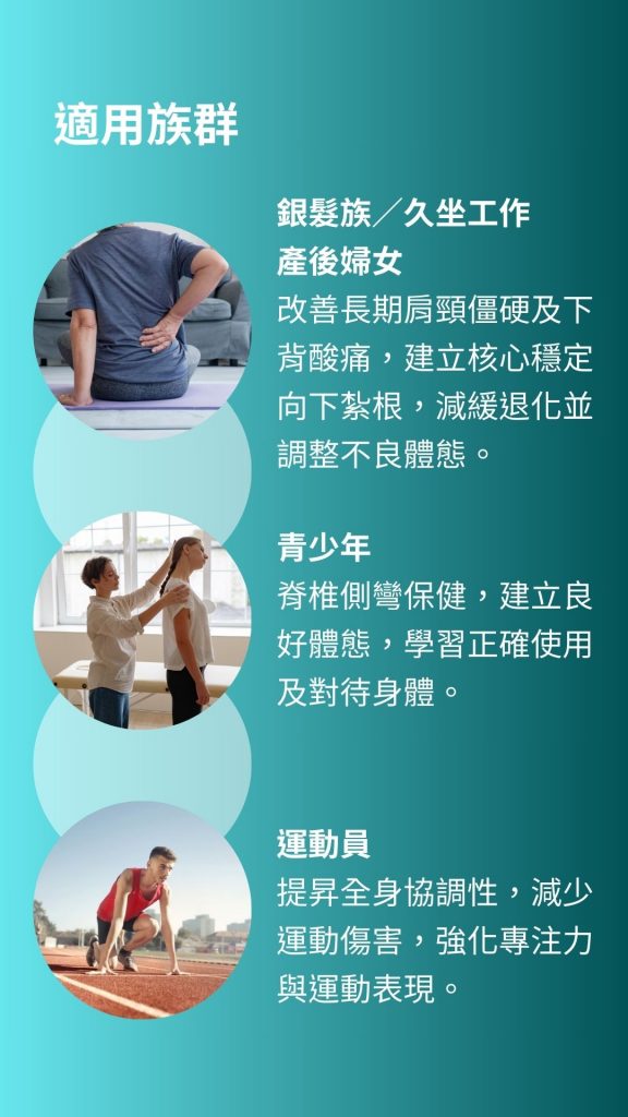 脊椎長期不適,身體僵硬緊繃,想透過運動保健改善骨盆前傾圓肩駝背,找到身體回正的能力並遠離肩頸僵硬下背疼痛,同時身體無特殊脊椎或骨骼肌肉疾患之亞健康族群。