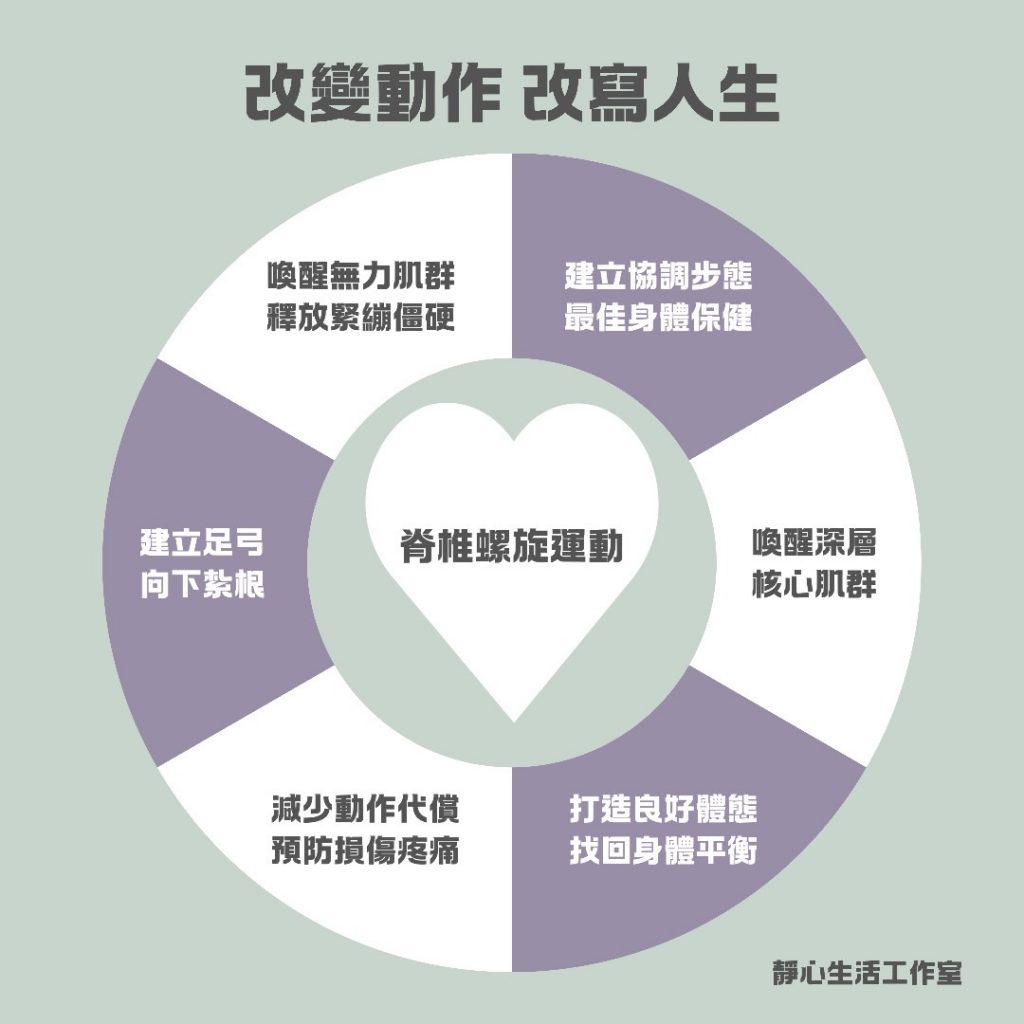 上了兩期的脊椎螺旋課,從剛開始不太清楚身體錯誤的慣用行為,透過不斷的練習和覺察,還有老師在旁耐心的提醒和解說,終於開始能有意識地控制肌肉,身體長期的不適感也跟著減少了。動作都看起來很簡單,都是日常生活中常做的動作,但是否用到姿勢和正確發力,卻能有很不一樣的感受到,“阿~原來這些動作居然是要這樣做才對啊~”希望未來可以再繼續進步!